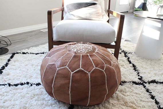 Classic Brown Leather Pouf Ottoman - Authentic Moroccan Style D�©cor Accent