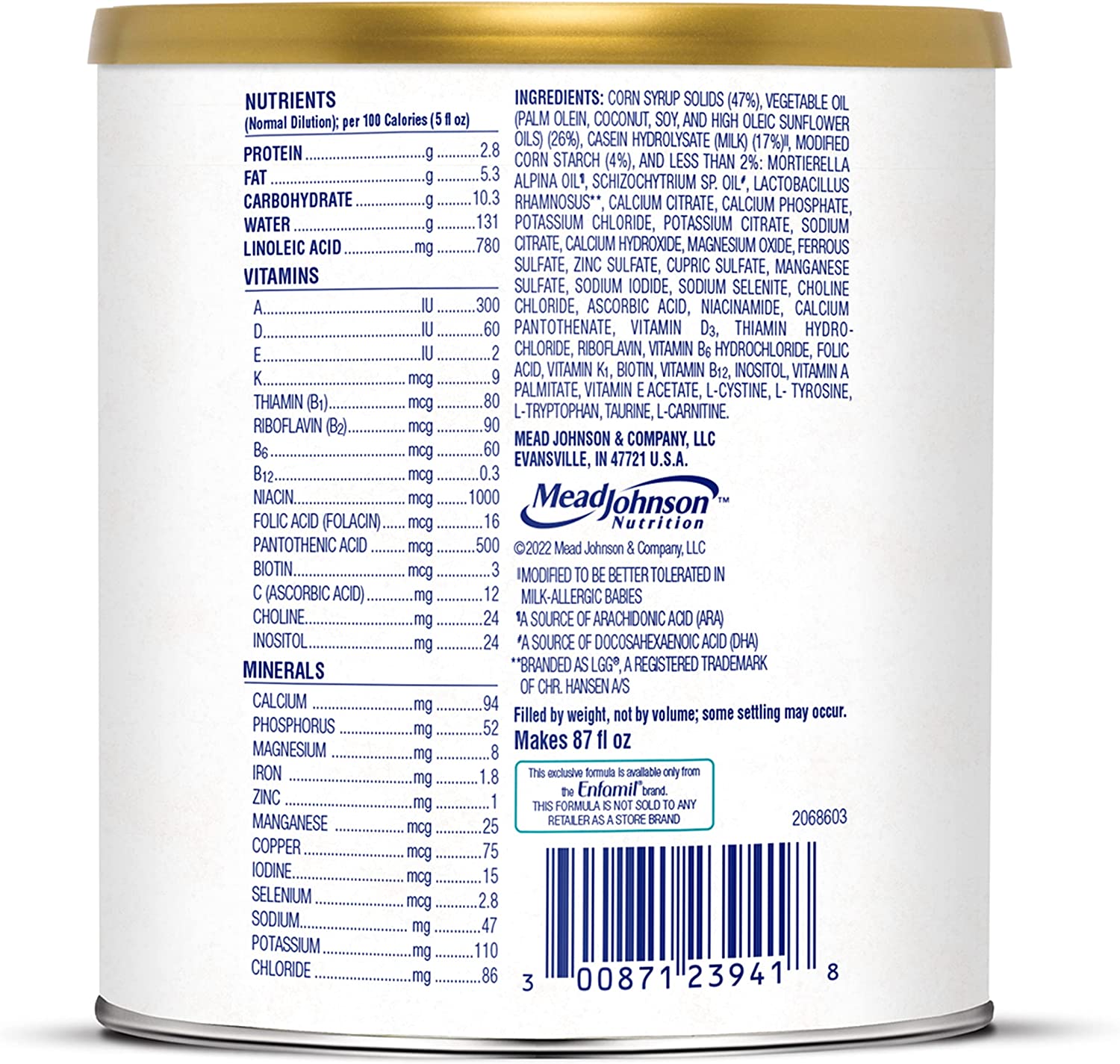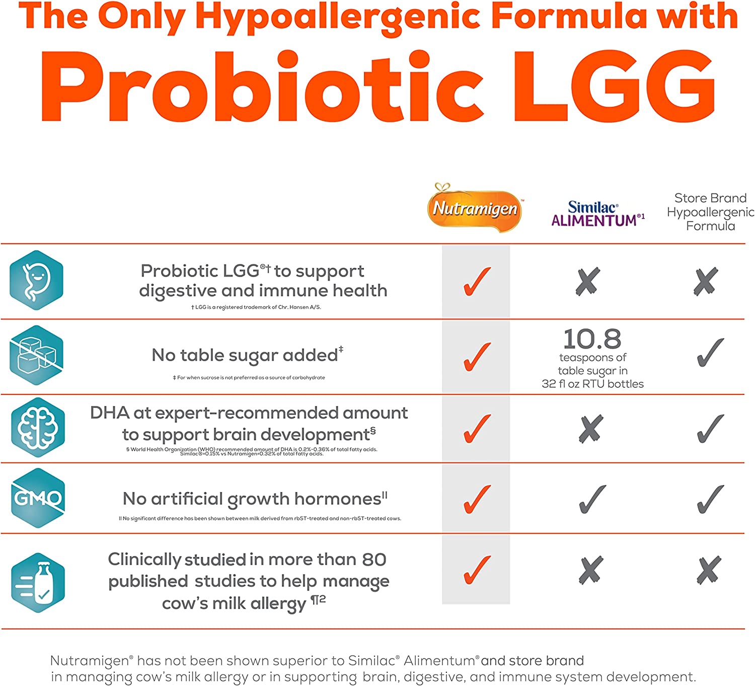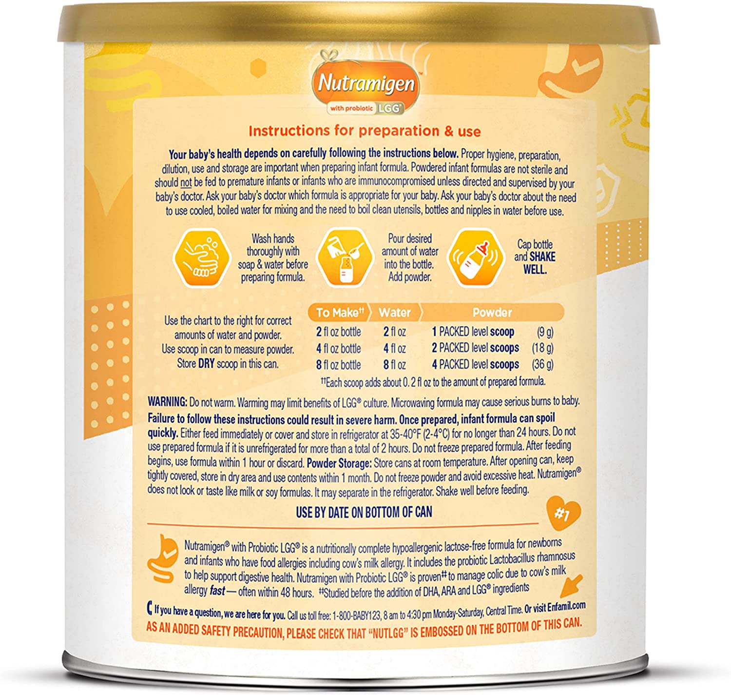 Nutramigen with Enflora LGG* is a proven hypoallergenic infant formula specially designed to manage colic due to cow's milk protein allergy. With the Power of Two, an extensively hydrolyzed protein to reduce babies' allergen exposure and the probiotic LGG to help the strength of their intestinal barrier, Nutramigen helps support infants with normal growth and development. Nutramigen is proven*** to manage colic due to cow's milk protein allergy FAST--often within 48 hours. For babies with allergies to the cow's milk protein found in regular infant formula, Nutramigen is a trusted and nutritionally balanced alternative for a baby's first 12 months.