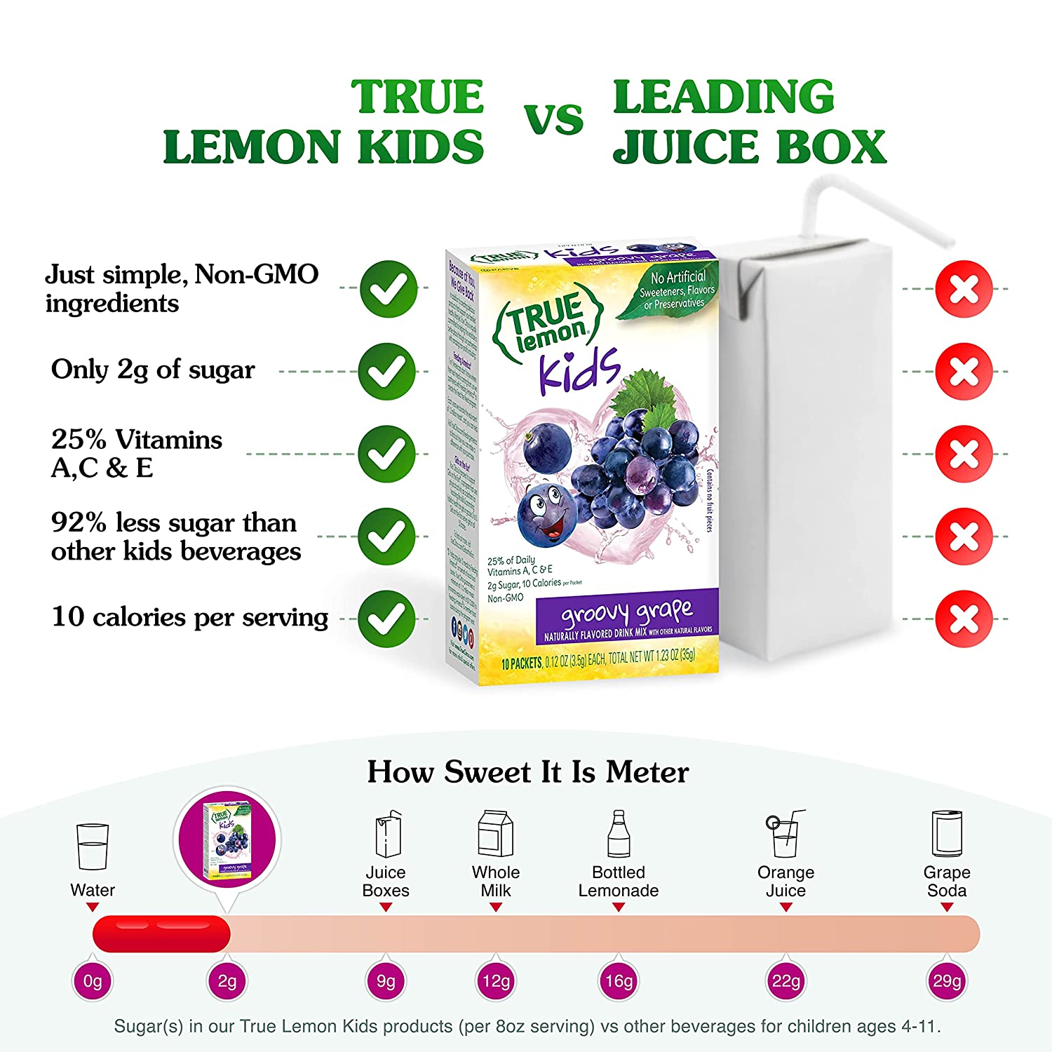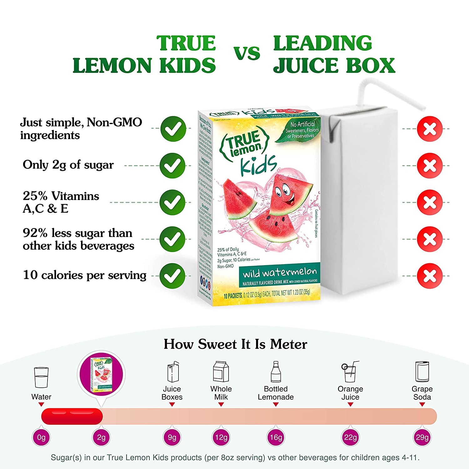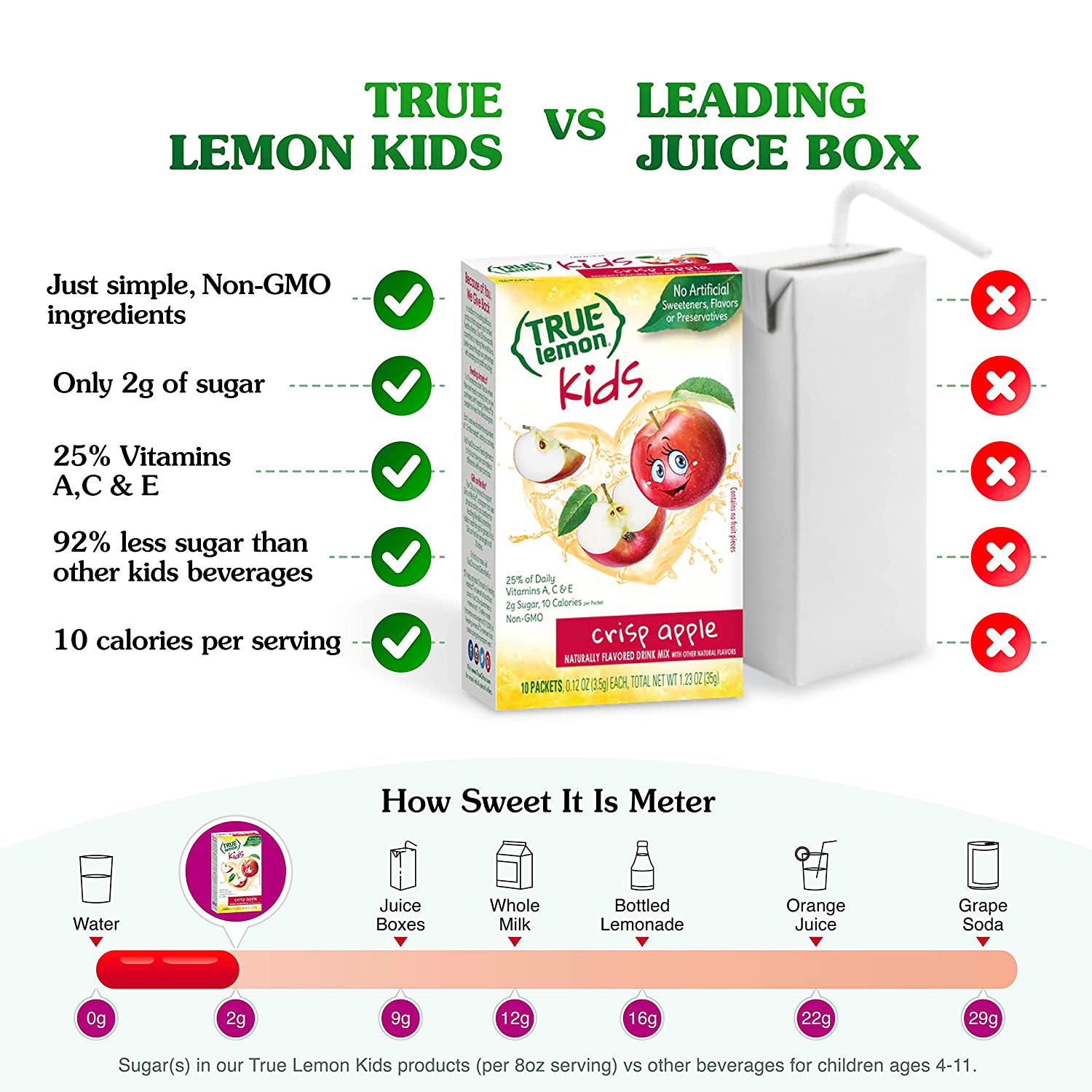 • PREMIUM INGREDIENTS, GREAT VALUE: While True Lemon Kids are made with clean, simple Non-GMO ingredients they don’t come with a premium price. Great for your wallet and the environment (no throwing away juice boxes, cans or bottles)!