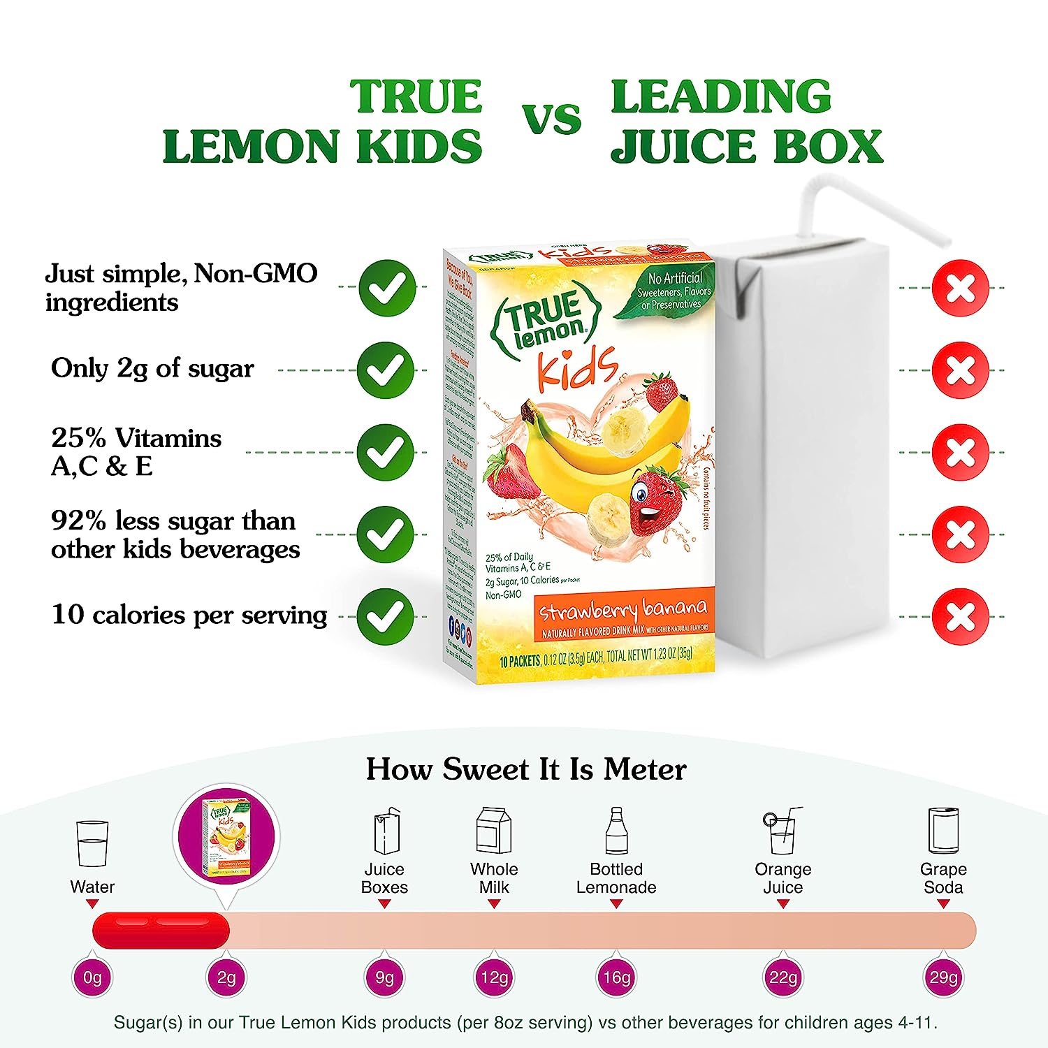 • LOW SUGAR: True Lemon Kids Fruit Punch is full of delicious flavors that kids love: pineapple, orange, and cherry so this kids drink mix makes it easy to keep your children deliciously hydrated. And, with only 2 grams of sugar per serving, True Lemon Kids has 92% less sugar than leading children beverages like juice and soda!