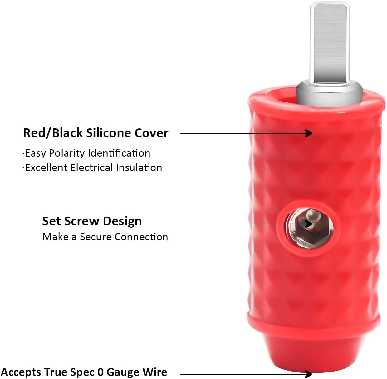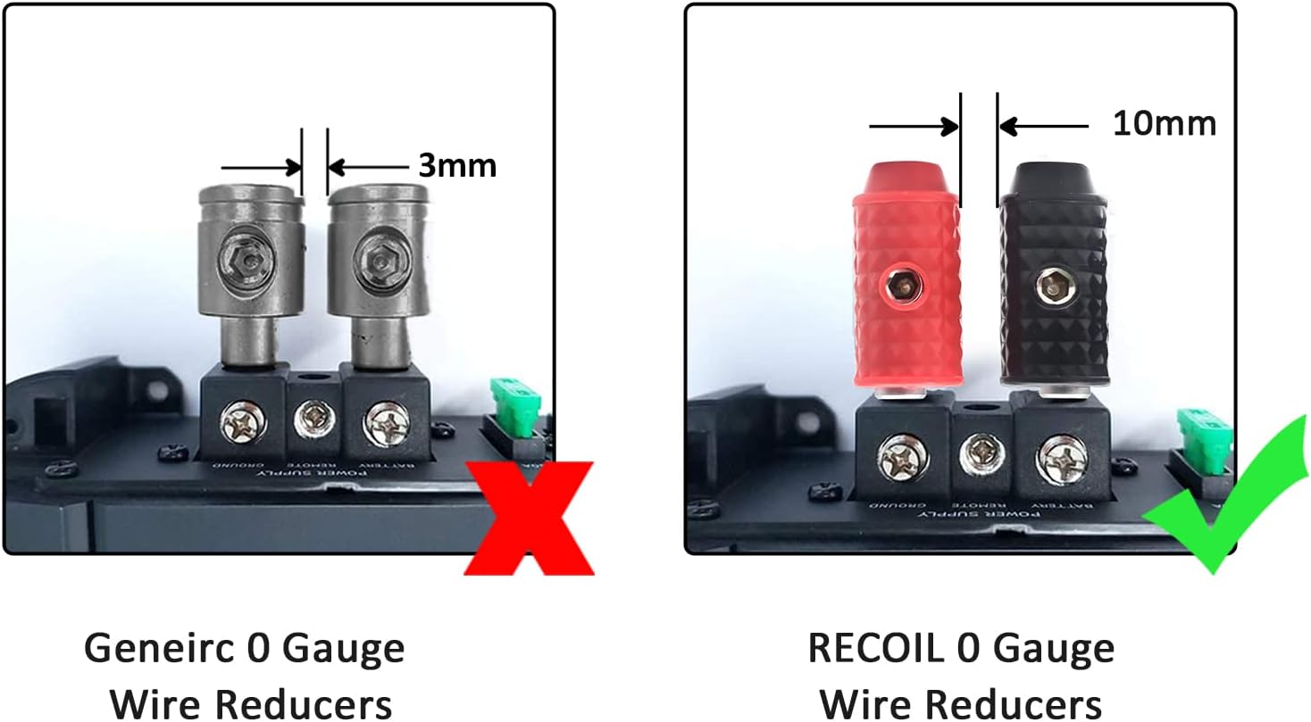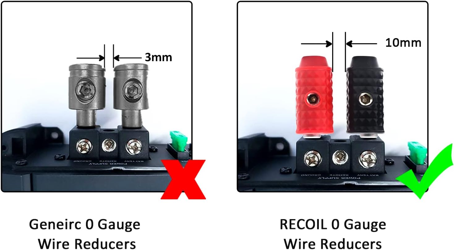 Recoil WR04 Amplifier Power/Ground Input Wire Gauge Reducer Brass 1/0 Gauge to 4 Gauge with Red/Black Silicon Covers, Marine-Grade Satin Chrome Finish, Pair