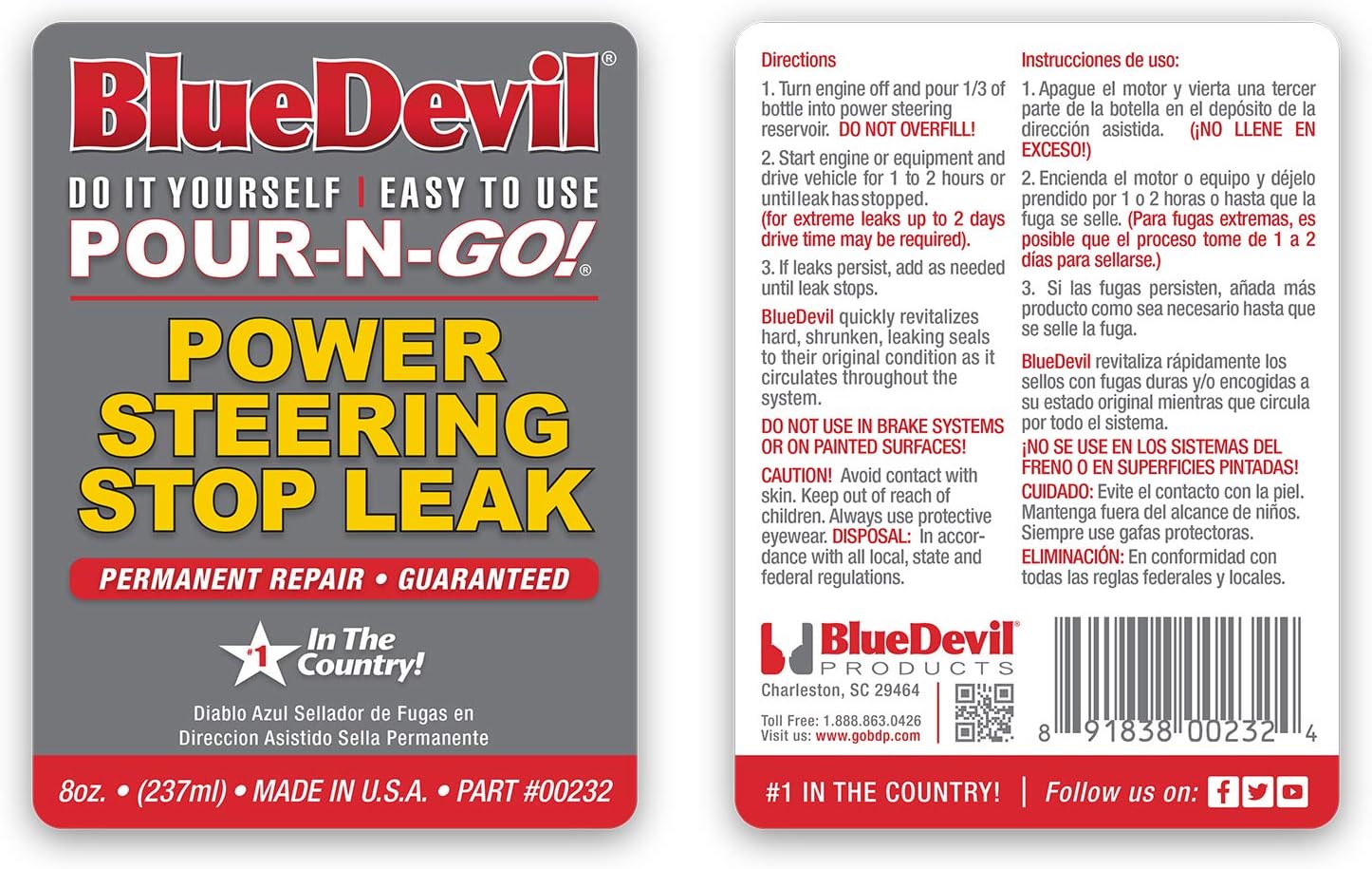 BlueDevil Power Steering Stop Leak permanently seals leaks in power steering, differentials, and worn rack and pinion systems. It’s safe and easy to use and guaranteed to work to stop leaks. BlueDevil Power Steering Stop Leak works on gasoline or diesel engines.
