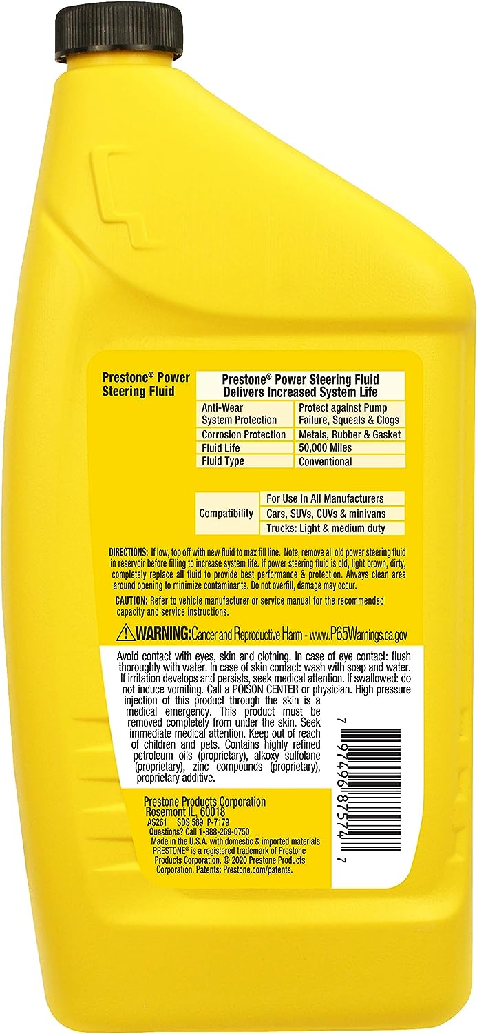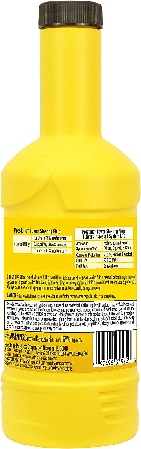 Prestone Power Steering Fluid is formulated with high-quality oil and fortified with additives to stop pump squealing, prevent wear, and protect seals, maintaining smooth power-steering operation. Compatible with factory fluids, it meets service requirements of GM, Ford, Chrysler and many global manufacturers. This formula contains several key ingredients to ensure smooth system operation: anti-wear agents to protect pump components; antioxidants to prevent sludge formation; seal conditioners to protect and rejuvenate seals; anti-foam agents to prevent pump cavitation and steering loss; corrosion inhibitors to protect metal components; and pour point depressants for good steering even in low temperatures.