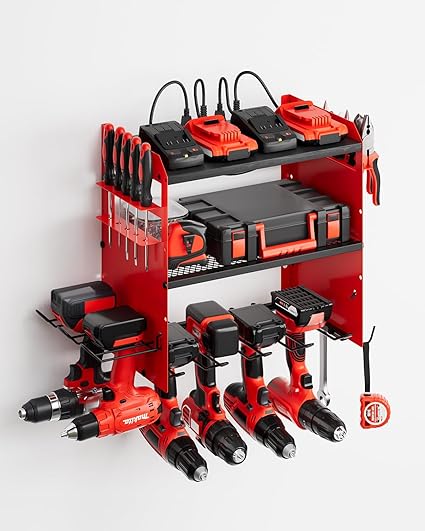 Dunatou Adjustable Power Tool Organizer Wall Mount with Charging Station, 6 Drill Holder & 4 Outlet, Wood Garage Tool Organizer Wall Mount Power Tool Rack with Hooks, Gift for Men