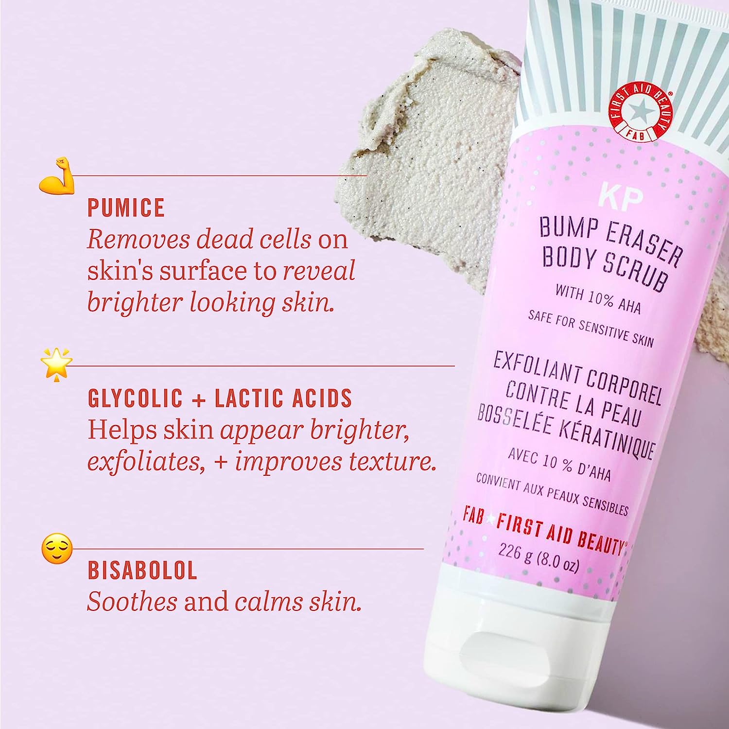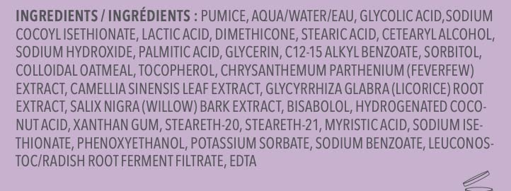 • Buff Away Dead Skin: Glycolic and Lactic Acids at a combined level of 10% help loosen skin’s top layer and decongest pores, while Pumice Buffing Beads (NOT microplastic!) whisk it all away