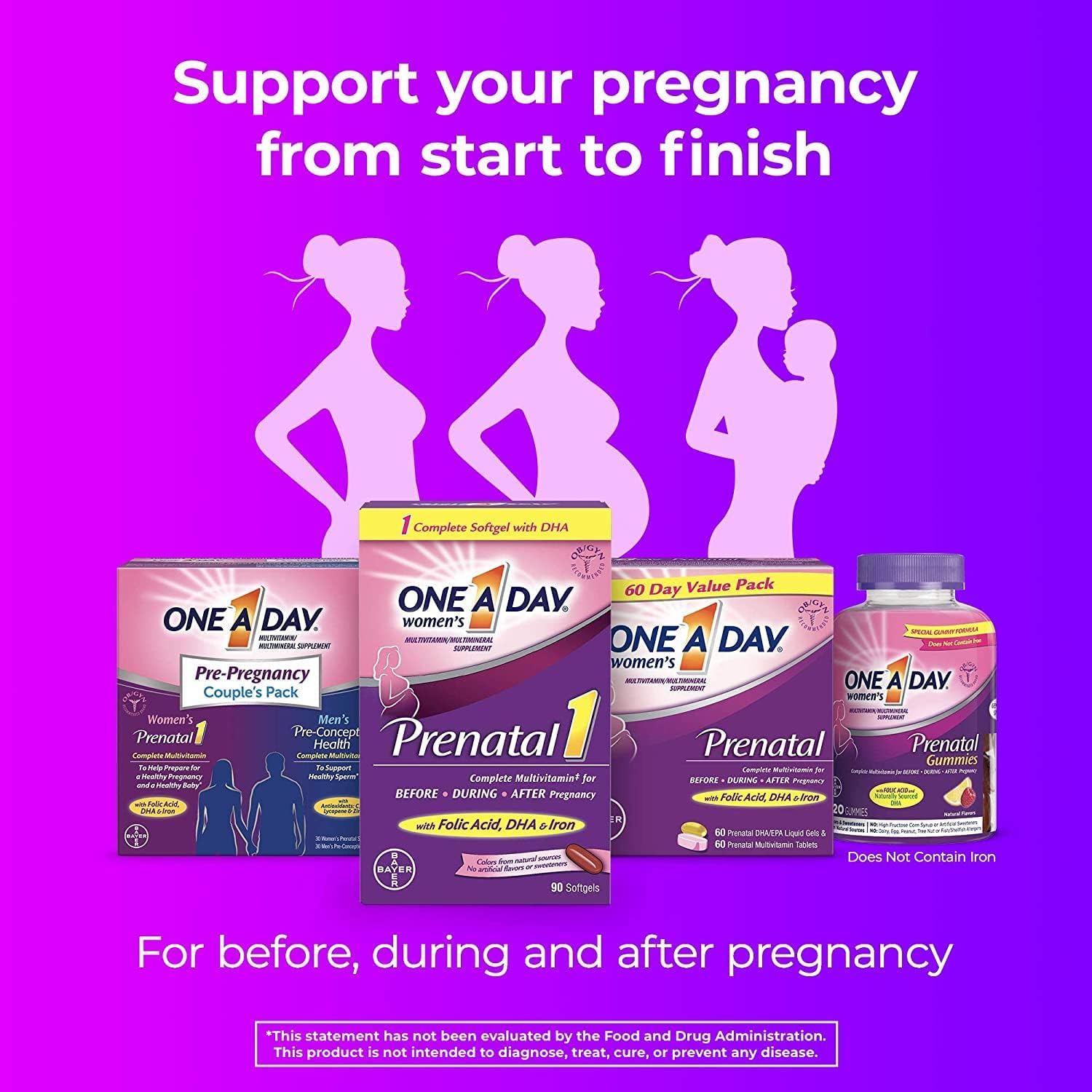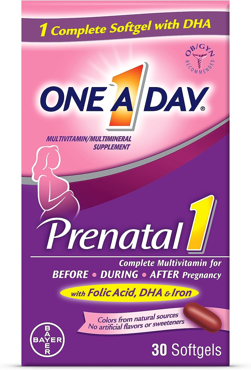 One A Day Women's Prenatal 1 is a complete Prenatal multivitamin that offers a wide variety of key nutrients in an easy-to-take Softgel designed for women through every stage of pregnancy. Adding a Prenatal multivitamin to your daily routines is an important step in providing nutritional support for pregnant women and babies throughout pregnancy and breastfeeding. This daily Prenatal multivitamin contains key nutrients such as Folic Acid, Omega-3 DHA, Calcium, Vitamins A, B6, B12, C, D, and E, Iron, Thiamin, Riboflavin, Niacin, Biotin, Iodine, Magnesium, Copper, Pantothenic Acid, and Zinc. DHA is an Omega-3 fatty acid that can help support healthy fetal brain and eye development. This easy-to-take Softgel supports the earliest and most critical stages of pregnancy, and it is commonly recommended to begin a Prenatal vitamin routine before you get pregnant. One A Day Women's Prenatal multivitamins are the #1 OB/GYN recommended over the counter brand of Prenatal multivitamins. One A Day Multivitamins can provide nutritional support that you and your growing family may need at every life stage.