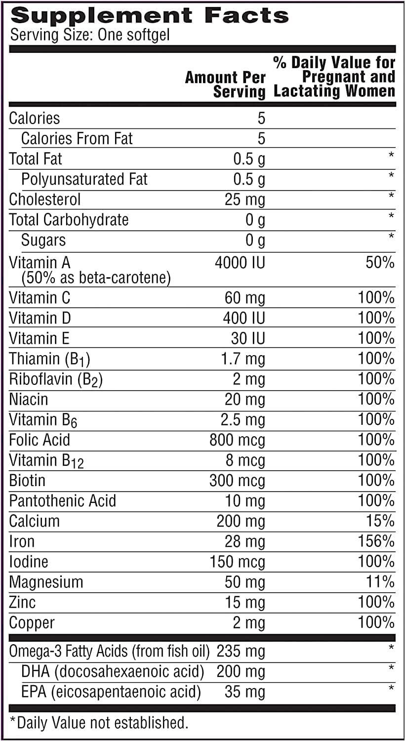 • Contains key nutrients Folic Acid, Omega 3 DHA, Calcium, Vitamin D, and Iron