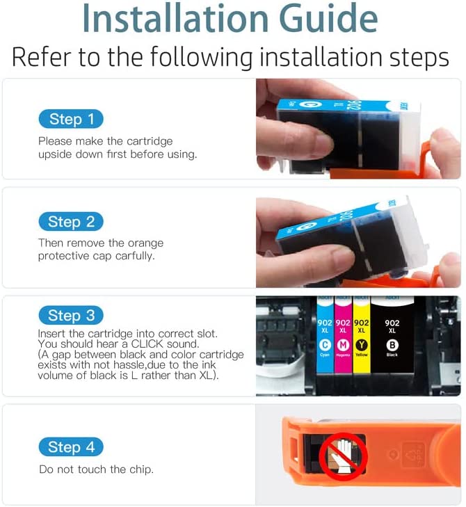 • Package Include: 1x 902XL Black, 1x Cyan, 1x Magenta, 1x Yellow, as replaqcement for hp 902 ink cartridges