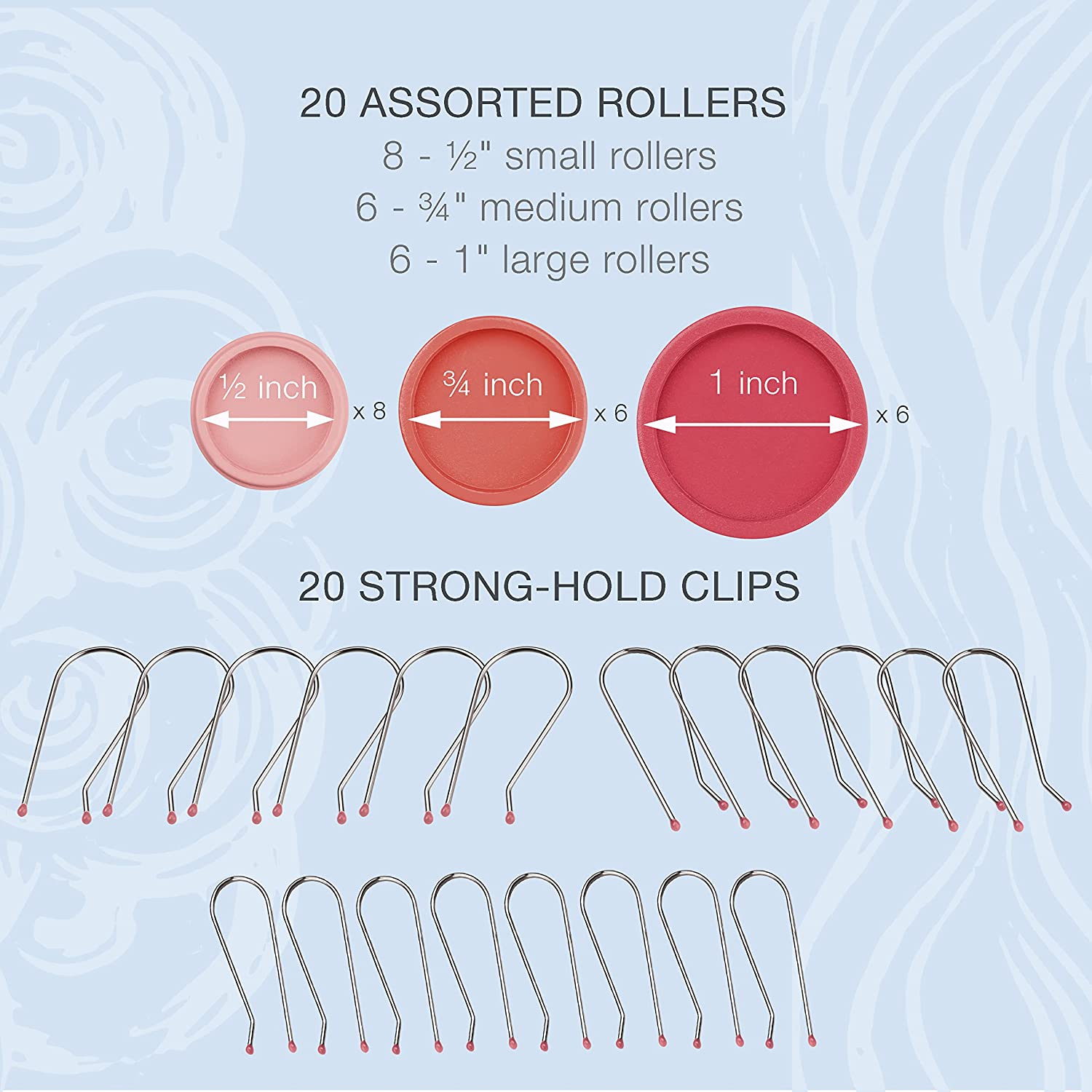 • Complete Set: This set includes 20 multi size, tangle free rollers: eight 1/2" (small), six 3/4" (medium) and Six 1" (large), plus 20 color coded stainless steel clips which can be stored inside the hair setter
