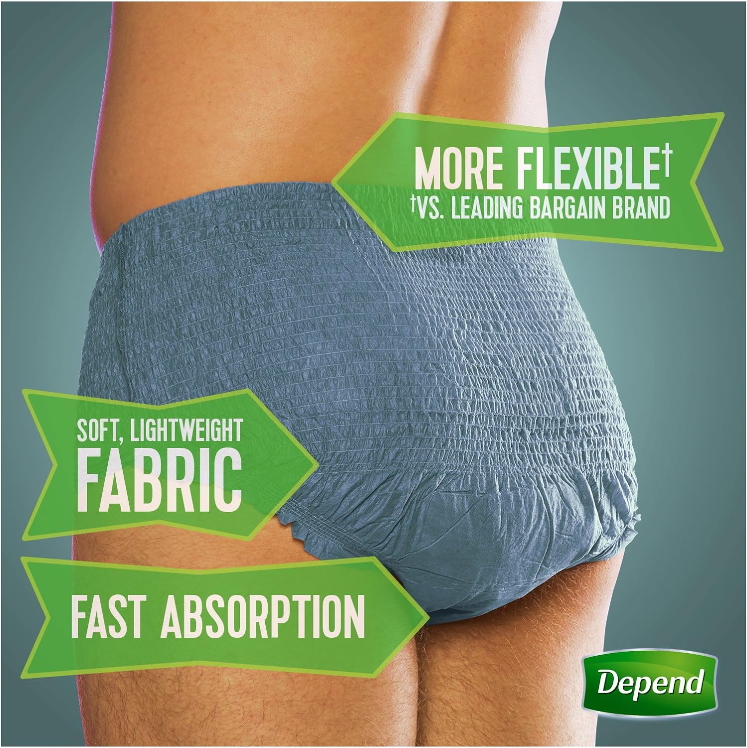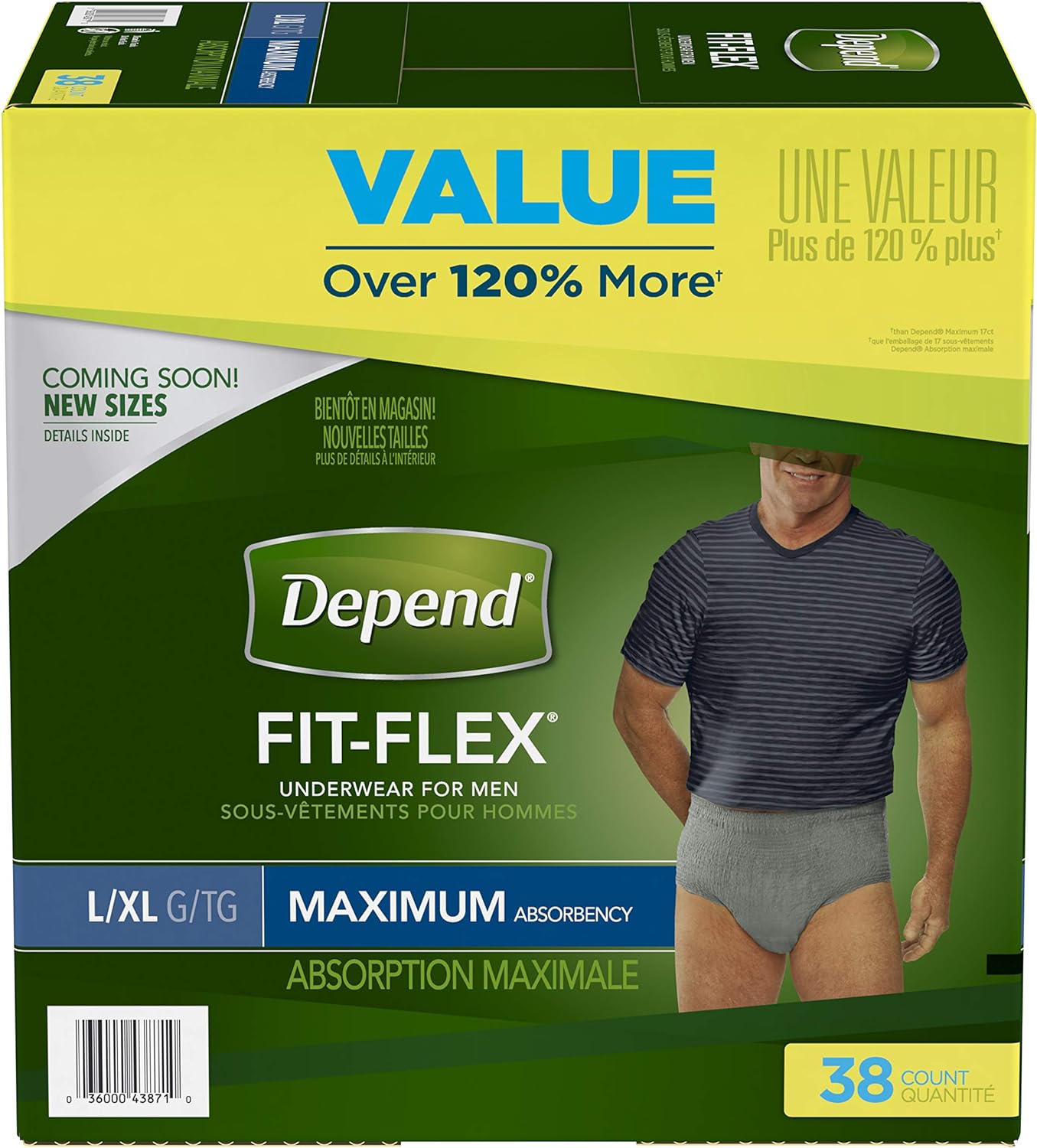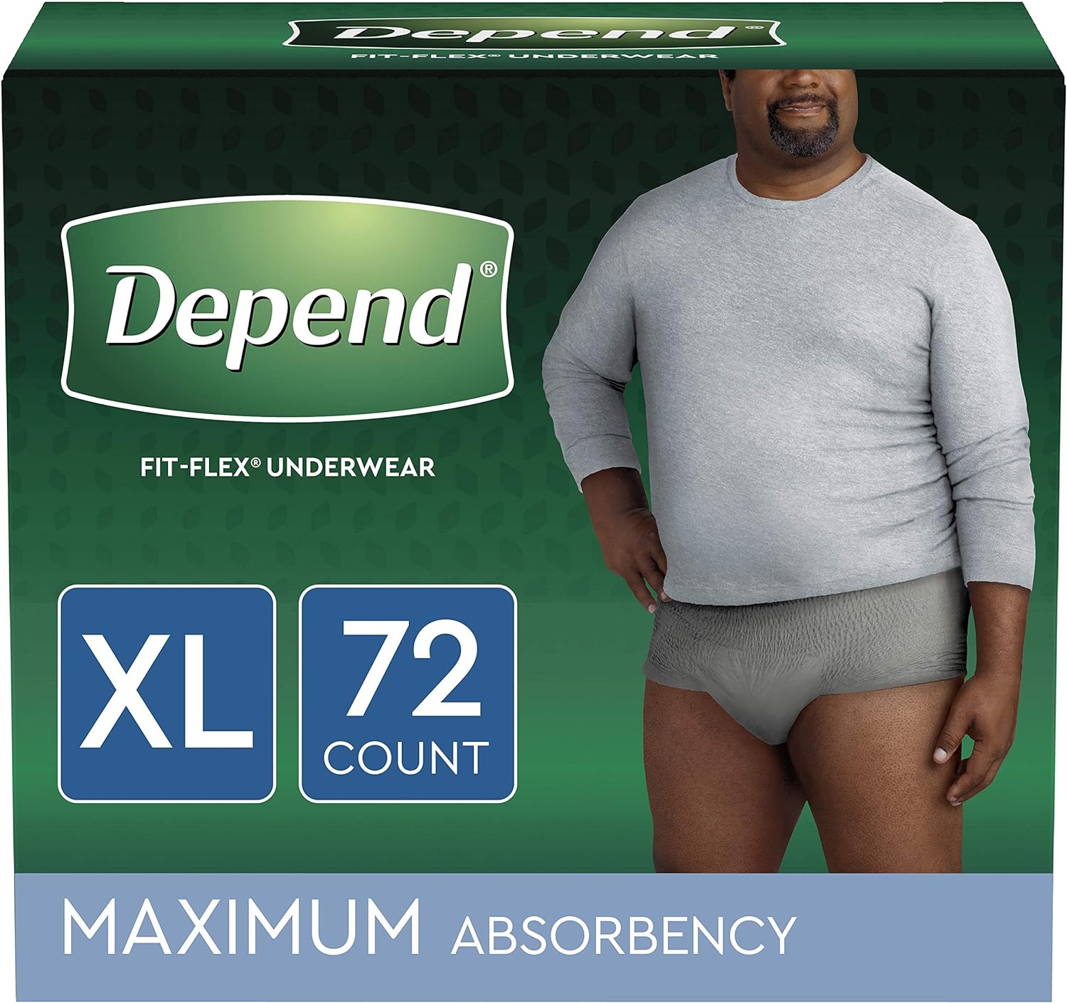 Reclaim and reconnect with what matters most in your life with Depend FIT-FLEX Men’s Incontinence Underwear providing Your Best Comfort and Protection Guaranteed.* Available in a masculine grey color, this disposable underwear is ideal for bladder incontinence. Extremely soft, yet strong, material instantly locks in wetness and odors, helping to keep you dry and worry-free with Trusted Protection. A comfortable, underwear-like fit - the SureFit waistband helps keep the briefs in place and the form-fitting elastic strands provide a smooth, discreet fit under clothing, unlike bulky adult diapers. Unscented absorbent incontinence underwear is natural rubber latex-free, lotion-free and fragrance-free. Underwear is soft, quiet and breathable.Depend for Men in Maximum Absorbency is available in three sizes - size small/medium (26-34 inch waist), size large (35-43 inch waist) and size extra-large (44-64 inch waist). Depend incontinence supplies always ship in a discreet box and are FSA-eligible in the U.S. Packaging may vary from images shown.*If you're not completely satisfied with the fit of your Depend, we can help. Purchase by 3/1/21. Mail in by 3/15/21. Online access required. Limit 1 per household. Original receipt/UPC required. Restrictions apply. See Depend website for details..