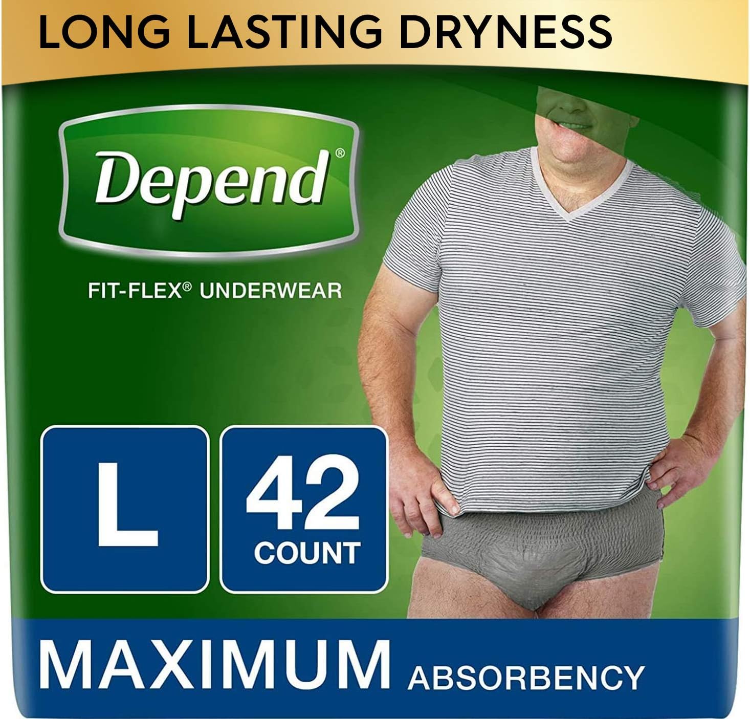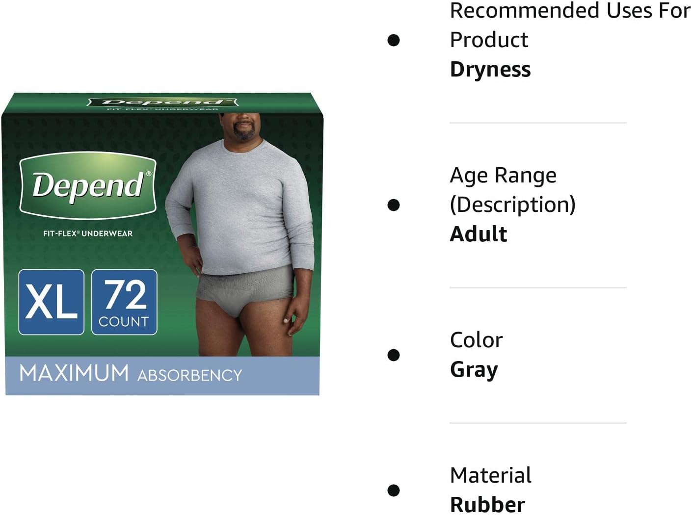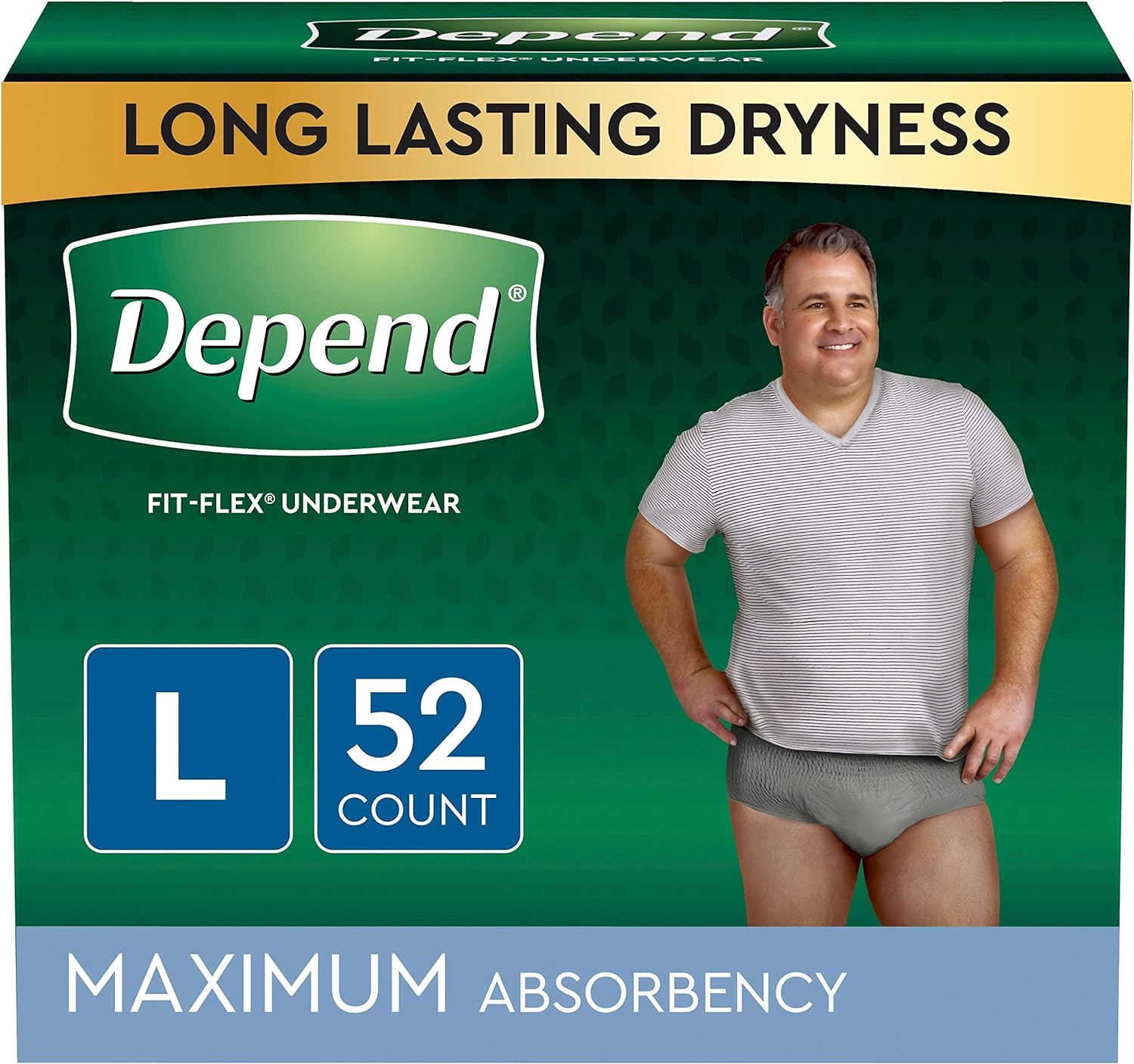 Reclaim and reconnect with what matters most in your life with Depend FIT-FLEX Men’s Incontinence Underwear providing Your Best Comfort and Protection Guaranteed.* Available in a masculine grey color, this disposable underwear is ideal for bladder incontinence. Extremely soft, yet strong, material instantly locks in wetness and odors, helping to keep you dry and worry-free with Trusted Protection. A comfortable, underwear-like fit - the SureFit waistband helps keep the briefs in place and the form-fitting elastic strands provide a smooth, discreet fit under clothing, unlike bulky adult diapers. Unscented absorbent incontinence underwear is natural rubber latex-free, lotion-free and fragrance-free. Underwear is soft, quiet and breathable.Depend for Men in Maximum Absorbency is available in three sizes - size small/medium (26-34 inch waist), size large (35-43 inch waist) and size extra-large (44-64 inch waist). Depend incontinence supplies always ship in a discreet box and are FSA-eligible in the U.S. Packaging may vary from images shown.*If you're not completely satisfied with the fit of your Depend, we can help. Purchase by 3/1/21. Mail in by 3/15/21. Online access required. Limit 1 per household. Original receipt/UPC required. Restrictions apply. See Depend website for details..