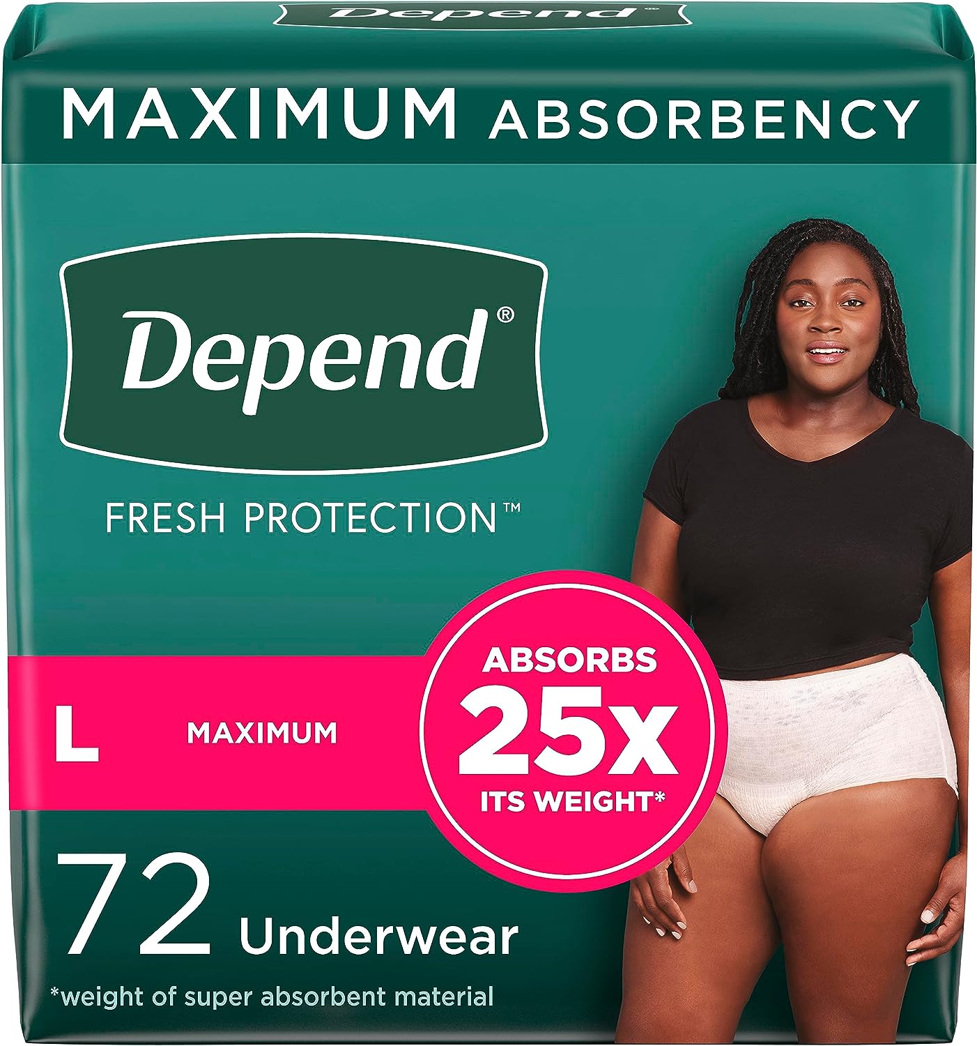 Protect against bladder leaks with Depend Fresh Protection Adult Incontinence Underwear for Women with Maximum Absorbency for all day protection guaranteed*. Leaks don’t stand a chance thanks to a super absorbent core which absorbs 25x its weight, turns liquid into gel, and neutralizes odors. Our technology features a liner that keeps you dry throughout the day by wicking wetness away from your skin. Comfortably live your life with incontinence underwear that features a discreet fit, soft and smooth fabric, and a SureFit waistband helps keep underwear securely in place. Find your fit with five sizes—small (24–30" waist), medium (31–37" waist), large (38–44" waist), extra-large (45–54" waist) and extra-extra-large (55–64" waist)—in a stylish blush color. Depend incontinence products for bladder leaks and postpartum bladder leaks are also HSA/FSA-eligible in the U.S. Also, check out our Depend Night Defense Adult Incontinence Underwear for Women to protect against nighttime bladder leaks and postpartum bladder leaks! *If you’re not completely satisfied with the fit of your Depend incontinence underwear, we can help. Purchase by 12/31/24. Mail in by 1/31/25. Online access required. Limit 1 per household. Original receipt/UPC required. Restrictions apply. See Depend website for details.