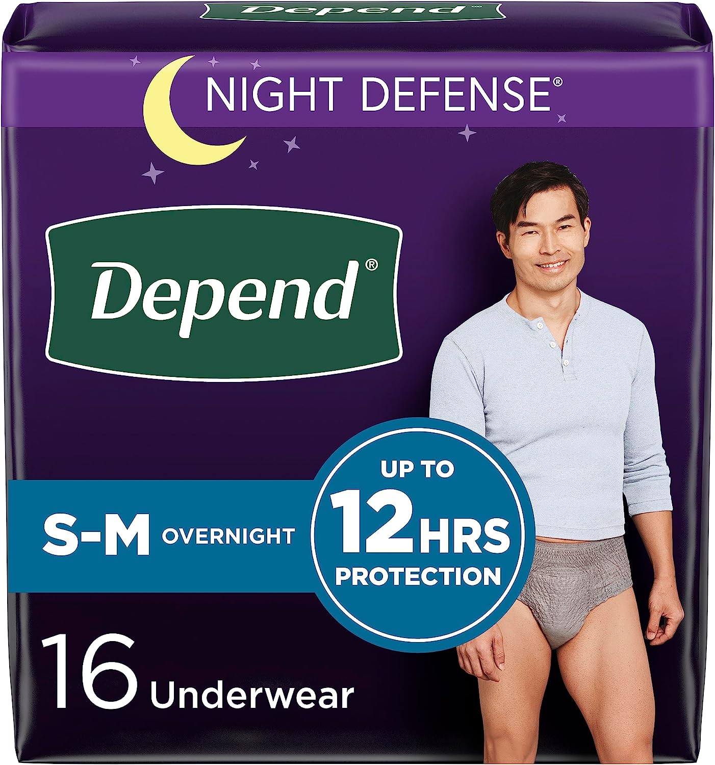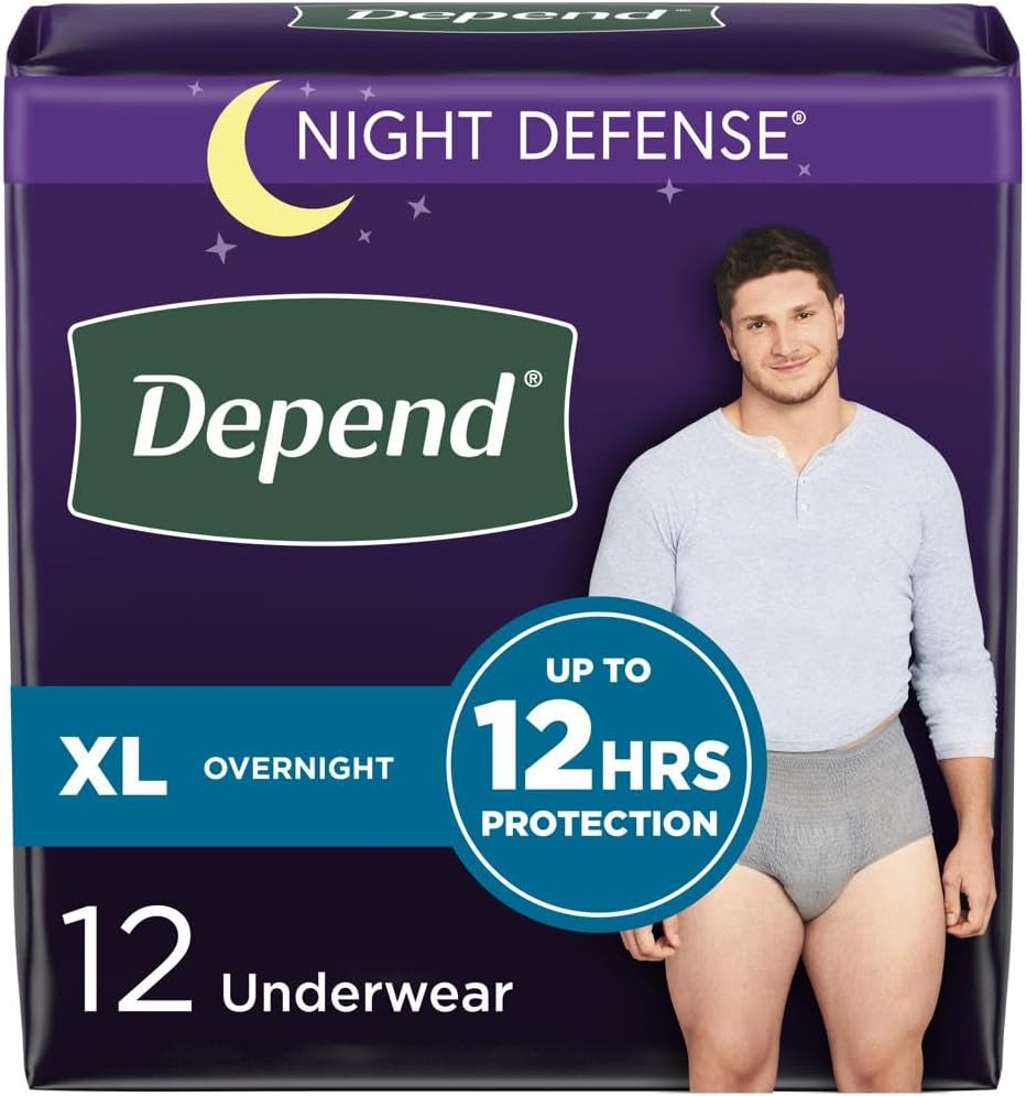 Sleep through the night with Depend Night Defense Adult Incontinence Underwear for Men with Overnight Absorbency, providing up to 12 hours of protection. Available in a classic grey color, this disposable underwear is ideal for bladder incontinence for nighttime use, featuring a super absorbent core which absorbs 25x its weight and turns liquid into gel, neutralizing odors and locking wetness in place. Depend’s improved liner is 2x drier than before and helps keep you dry all night by wicking wetness away from your skin. Depend Night Defense for Men provides a discreet fit, soft and smooth fabric, and a high-performance waistband that helps keep underwear securely in place and helps you sleep worry-free. Depend Night Defense incontinence underwear for men is available in three sizes: size small/medium (26–34" waist), size large (35–43" waist) and size extra-large (44–54" waist). Packaging may vary from images shown. Some more good news: This product is HSA/FSA-eligible in the U.S.