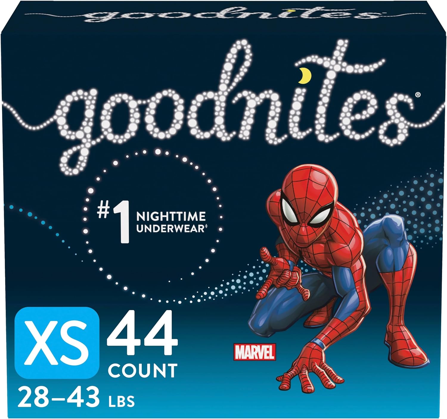 Goodnites is the #1 Nighttime Underwear* for bedwetting and helps your kids wake up feeling awesome. Goodnites Overnight Bedwetting Underwear for Boys provide 35% less leaks** and holds up to 3 water bottles***. Goodnites Bedwetting Underwear offers our best fit and protection guaranteed**** for kids ages 3 and up. These disposable bedwetting pants are made with 5 Layer Protection and reinforced Double Leg Barriers. As our most comfortable nighttime protection, our overnight bedwetting pants feature super stretchy sides to fit many body shapes and sizes. Unlike training pants, Goodnites disposable bedwetting underwear discreetly absorb odor and offer 40% more protection vs. the leading training pant. Plus, our nighttime bedwetting pants are clinically proven to be hypoallergenic and are free of added fragrances, parabens and elemental chlorine bleaching. Coming in Marvel superhero designs, Goodnites Boys' Bedwetting Underwear offer more sizes for a comfortable, tailored fit up to 140+ lbs and are available in Size XS (28-43 lbs), S/M (43-68 lbs), L (68-95 lbs) and XL (95-140+ lbs). FSA/HSA-eligible in the US. (*Youth Pant category share data) (**Boys Large vs. other national brand) (***three 8 fl oz water bottles, 24 fl oz in total. Applicable for Boy L and Boy XL only) (****If you're not completely satisfied with the fit of your Goodnites Underwear, we can help. Original receipt/UPC required. Restrictions apply. See Goodnites website for details. Purchase by 12/31/2023. Mail in within 30 days of purchase, no later than 02/28/2024)