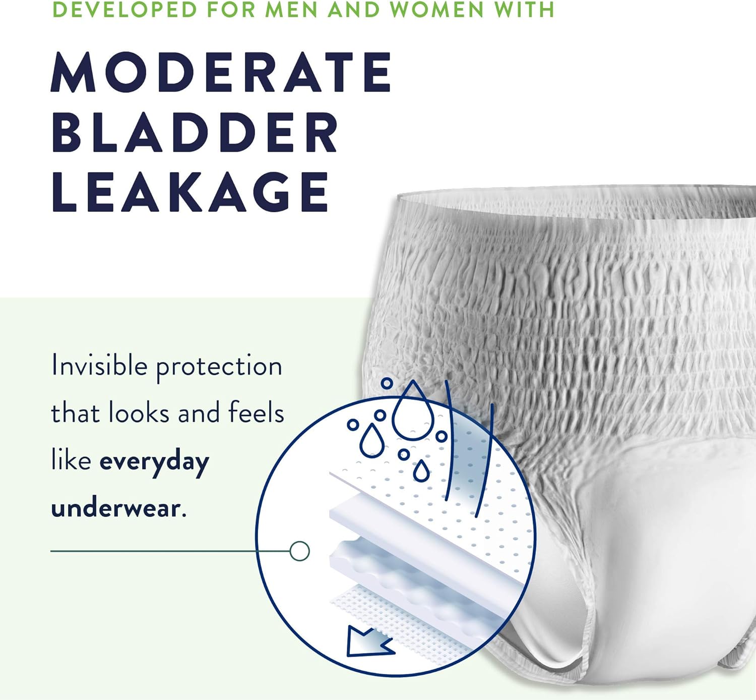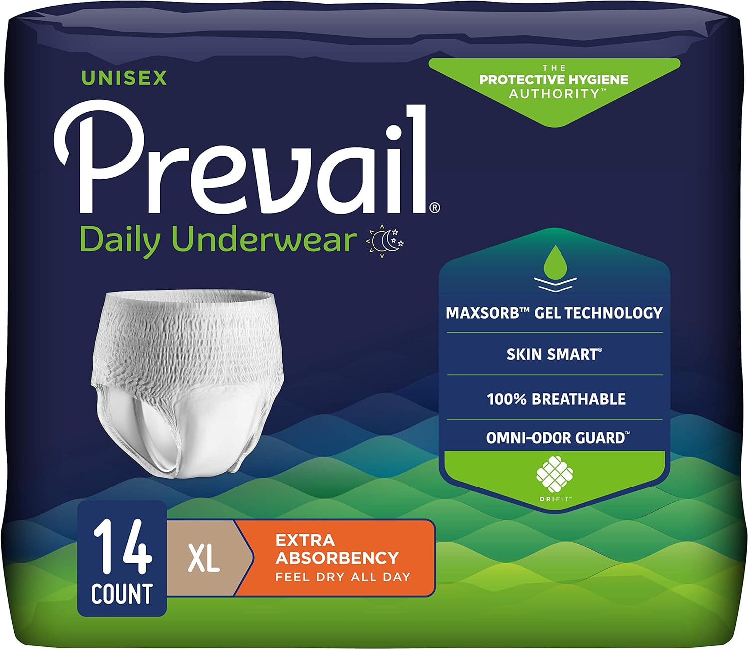 Designed for extra leakage protection, Prevail Underwear features Comfort-Shape Plus with gentle elastics that shape to your body for a more comfortable and discreet fit than standard adult diapers. The cloth-like outer cover is soft and comfortable for all-day wear while ventilated waist panels allow air to pass through, reducing heat buildup and promoting healthy skin. Prevail Underwear is the #1 rated brand in the healthcare industry. Each product is constructed with a discreet core technology that allows for thinner, highly-absorbent material that enables the user to move more freely and confidently. Combined with a super absorbent polymer for dual protection, Odor Guard technology is proven to reduce the total amount of odor-causing ammonia formed during and after use. Moisture is quickly locked in upon contact for added leakage protection while the soft outer fabric provides additional all-day comfort. Extra large size fits waist sizes 58 to 68 inches for a snug and comfortable fit. Each Prevail incontinence product features a proprietary Quick Wick layer of material with MaxSoft Technology that provides advanced softness with rapid liquid absorption for optimal product performance. This package includes four packs of underwear with 14 pairs per package for a total of 56 individual pairs of disposable underwear. Prevail adult care products are manufactured in Pennsylvania with attention to quality, safety, sustainability, and responsible sourcing practices by First Quality, a family-owned company. First Quality is a leader in developing premium quality products. In addition to our collection of adult care products, we also offer lines of baby products, feminine care, paper products, and bottled water.