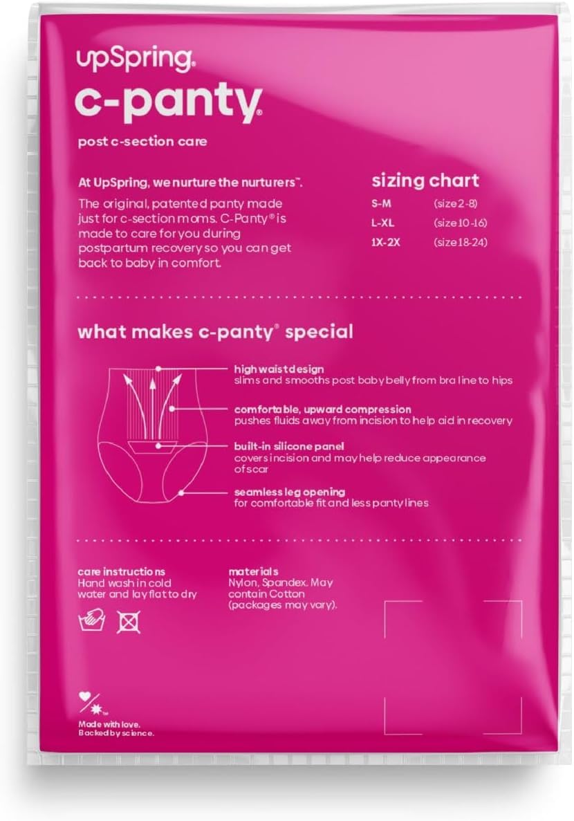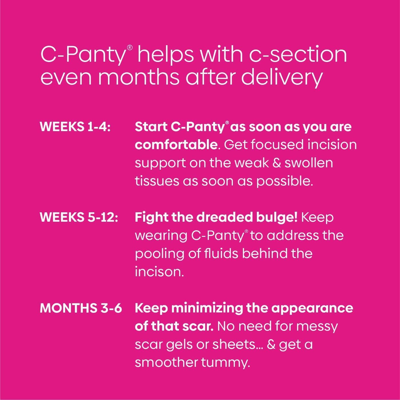 MADE FOR C-SECTION MOMS: You had a baby and a surgery. C-Panty helps address the post-surgical part of your baby's arrival with RECOVERY CARE. This includes 2 components so you can get back to baby in comfort. #1 - COMFORTABLE, UPWARD COMPRESSION to help push fluids away from the incision area, and #2 A BUILT-IN SILICONE PANEL provides targeted support of the incision and may help reduce the appearance of scars. C-Panty is the original, patented recovery product to have these integrated features. No velcro, sticky strips, granny panties or cotton boxers that don't hurt but don't help! Long after you've tossed the disposable panties, too tight shapers and bulky binders, C-Panty will be hard at work. Provides SLIMMING & SHAPING postpartum support. FSA/HSA eligible. Pack in your hospital bag. Add to your baby shower registry. Patented. Imported. NOT INTENDED TO BE USED FOR WEIGHT LOSS. Not intended to reduce waist circumference. PRECAUTIONS: DO NOT USE ON OPEN WOUNDS. C Panty can only be used if the incision is fully closed and healed (no scab remaining). To use earlier, cover silicone panel with a panty liner.