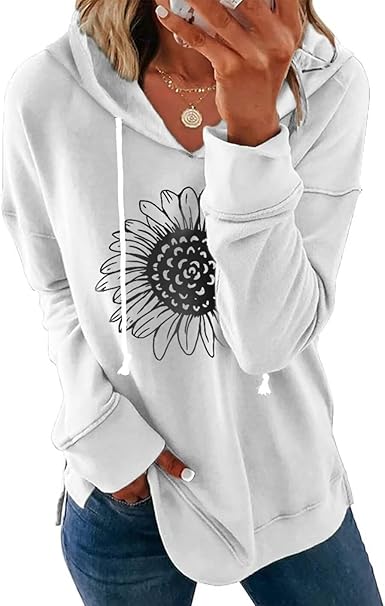 Women Sunflower Graphic Hoodies Long Sleeve Pullover Drawstring Sweatshirt Loose Fit Tunic Tops