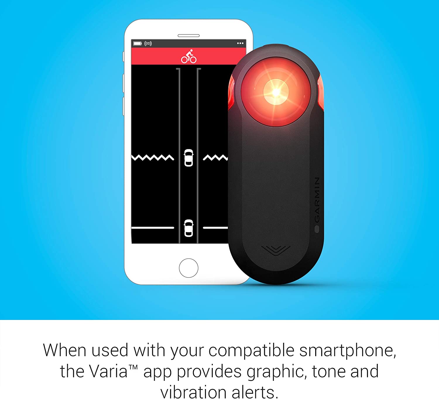 • When used with your compatible smartphone, the Varia app provides graphics — plus tone and vibration alerts — that indicate approaching cars