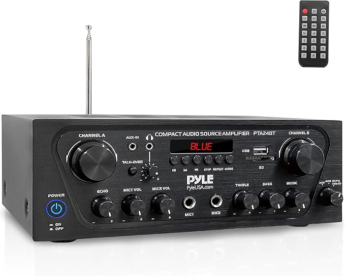 Pyle -Upgraded- 2 Channel Karaoke Home Audio Amplifier w/Bluetooth for Streaming, AUX-in, USB, 2 Microphone Input w/Echo Effect, Talkover for PA, Compact Footprint, Black