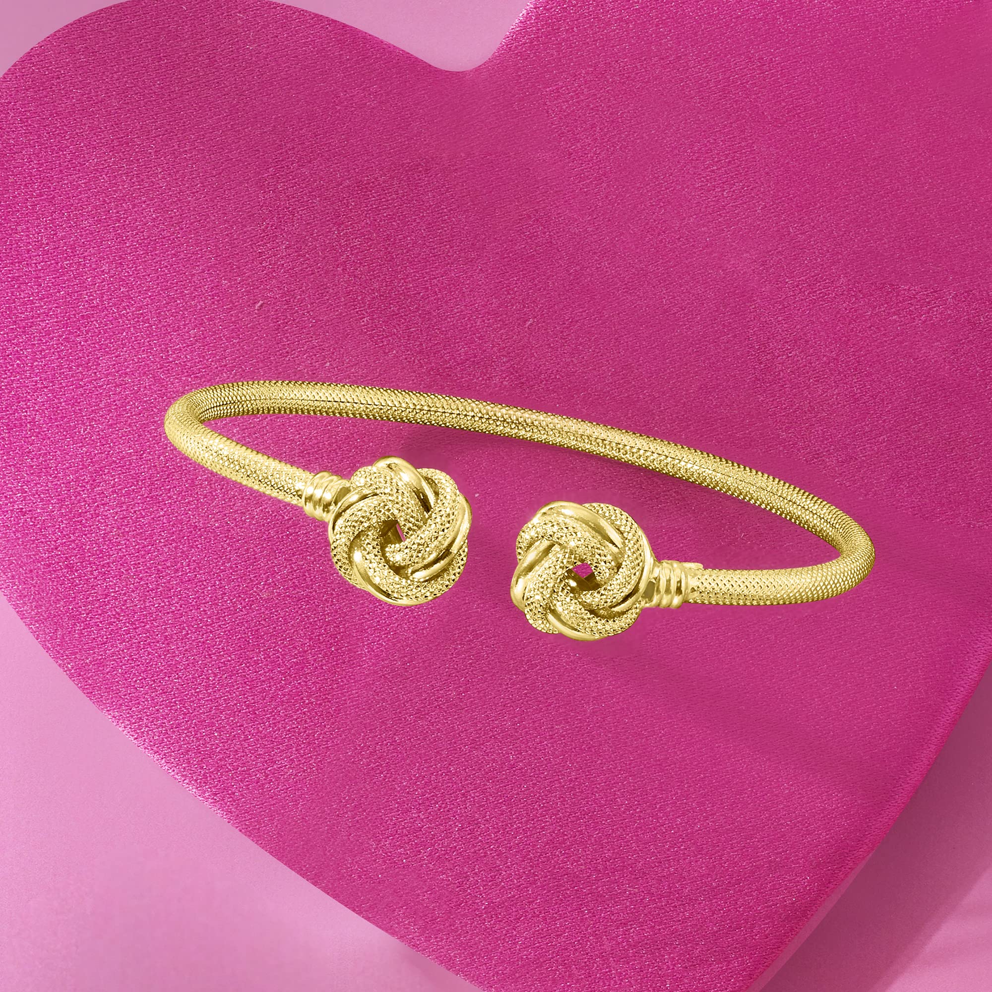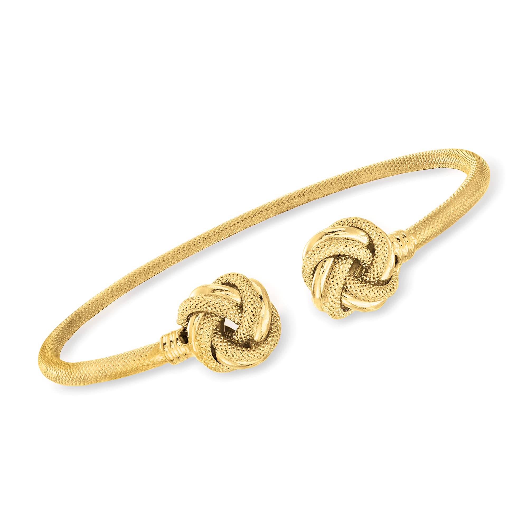 Details: With a commitment to quality and affordability, Ross-Simons presents timeless jewelry for the modern woman. Capped with love. This Italian-made cuff bracelet takes elegance up a notch with two love knots at either end. Crafted in textured and polished 14kt yellow gold. Slip-on, 14kt yellow gold cuff bracelet. Each Ross-Simons item arrives in a fine jewelry presentation box. Shop Ross-Simons jewelry risk-free as all items include a 30-day, 100% money-back guarantee.