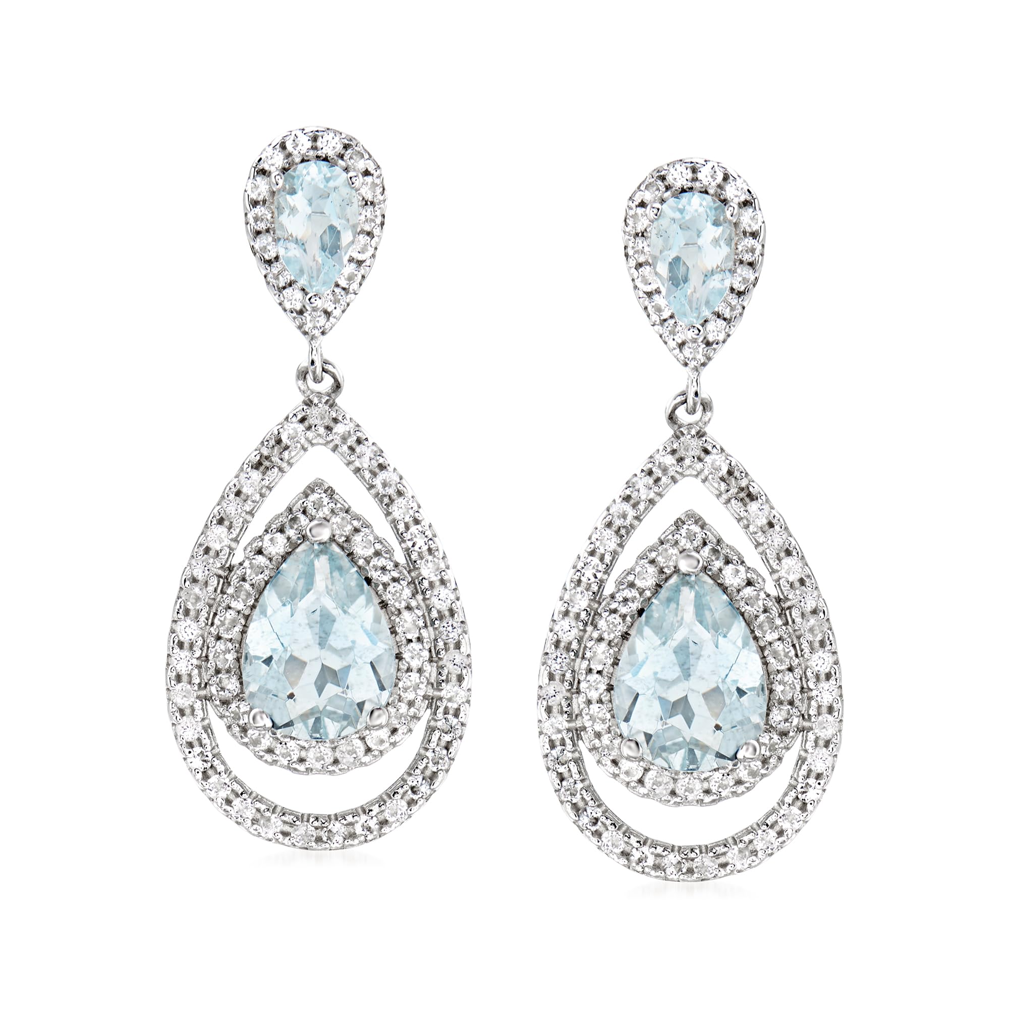 Details: Ross-Simons is the authority on fashionable must-haves. These stunning drop earrings are the perfect addition to your formal wear! 2.60 ct. t.w. pear-shaped aquamarines sit within an open, double frame of 1.40 ct. t.w. white topaz gems. Set in polished sterling silver. Hanging length is 1". Wear with the matching pendant necklace for a luxurious combination (925276). Post/clutch, white topaz and aquamarine drop earrings. Each Ross-Simons item arrives in a fine jewelry presentation box. Shop Ross-Simons jewelry risk-free as all items include a 30-day, 100% money-back guarantee.