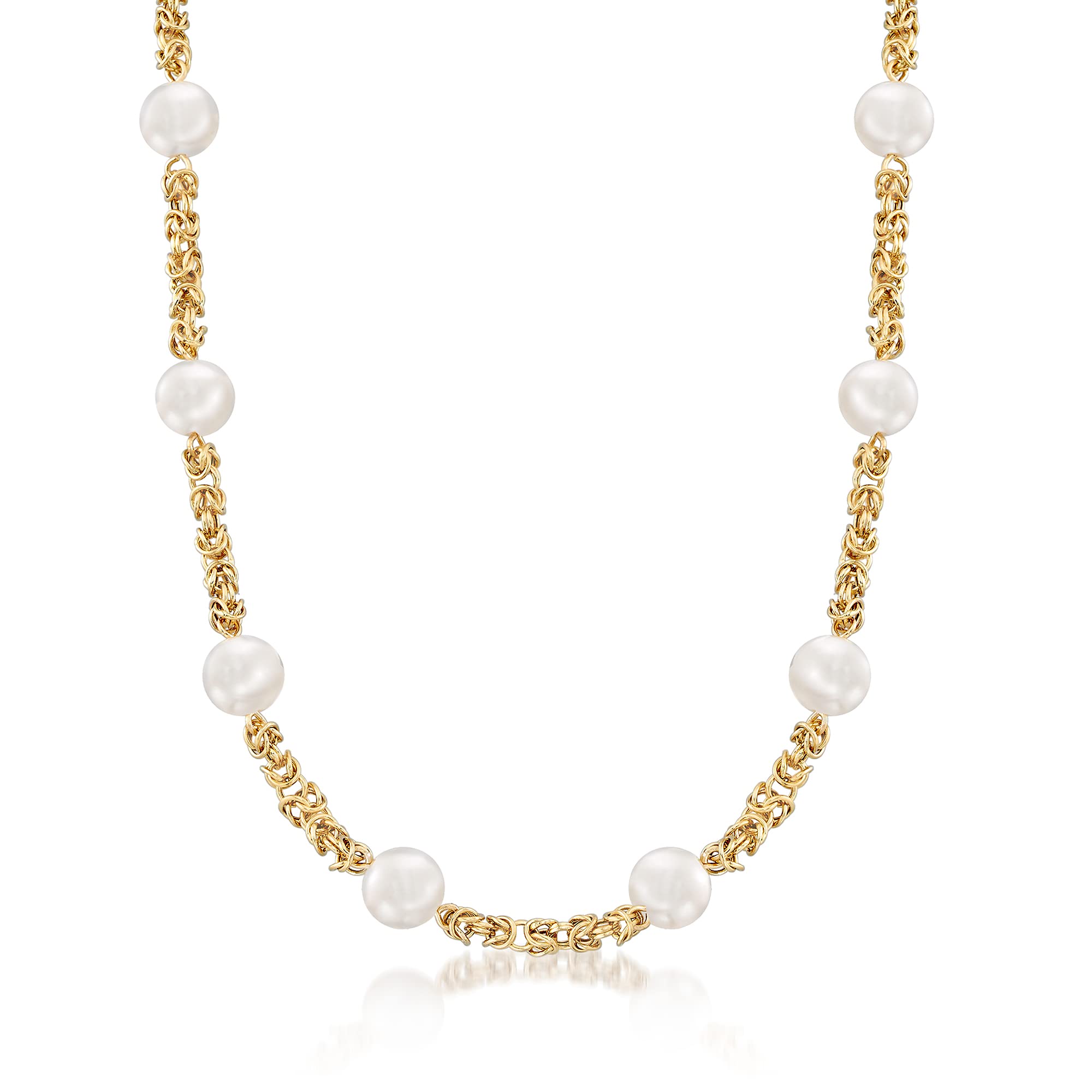 Details: Ross-Simons presents contemporary styles with a timeless appeal. Two traditional styles come together to create one gorgeous handcrafted design! Presenting luxurious 9mm cultured freshwater pearls in stations on a classic 14kt yellow gold Byzantine chain. This sophisticated look can be worn from workday to weekend. 3/8" wide. Lobster clasp, white pearl and 14kt yellow gold Byzantine station necklace. Each Ross-Simons item arrives in a fine jewelry presentation box. Shop Ross-Simons jewelry risk-free as all items include a 30-day, 100% money-back guarantee.