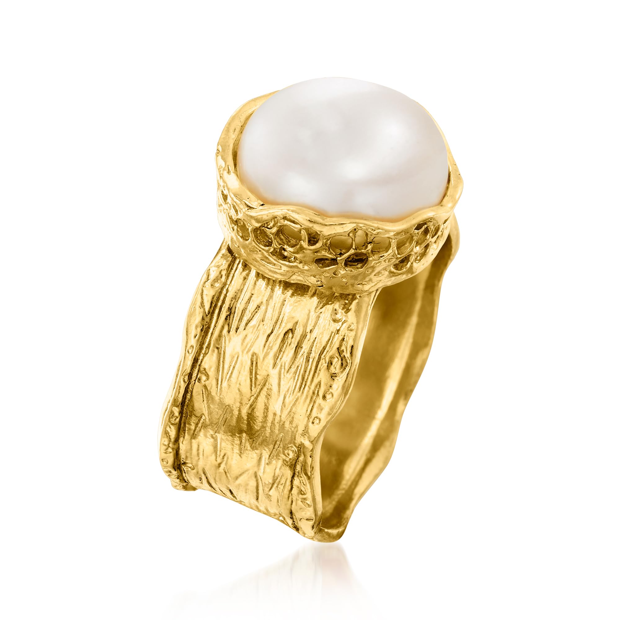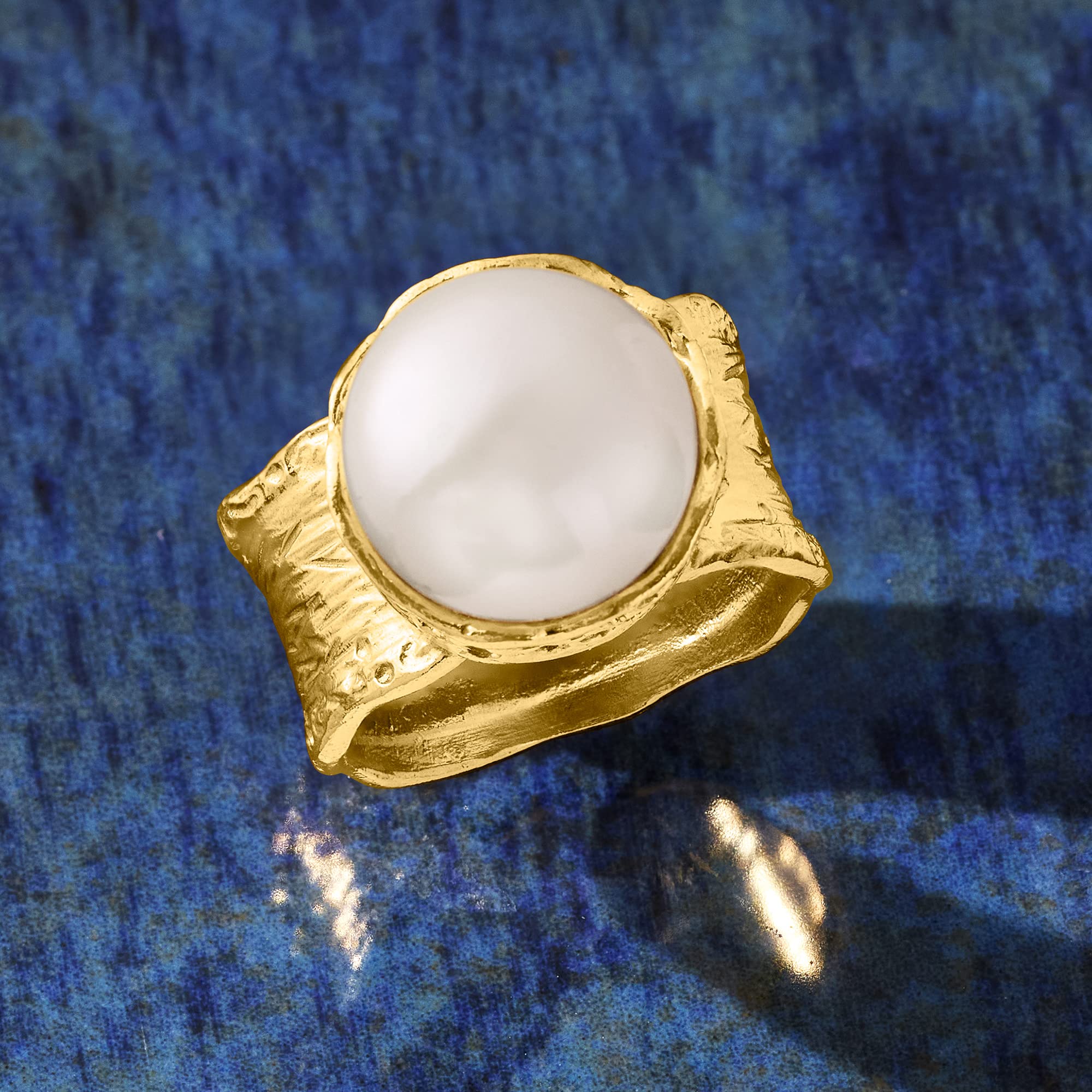 Details: With a commitment to quality and affordability, Ross-Simons presents timeless jewelry for the modern woman. This design presents an 11.5-12mm cultured freshwater button pearl from inside an 18kt yellow gold over sterling silver shank. A sophisticated statement; the eclectic textured and polished setting gives this ring its artisanal charm. 1/2" wide. Pearl ring.