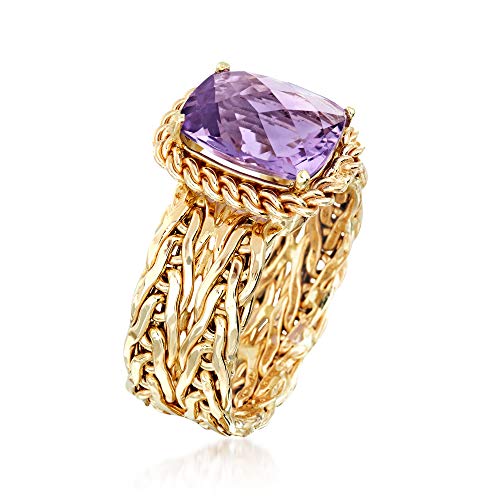 Details: With a commitment to quality and affordability, Ross-Simons presents timeless jewelry for the modern woman. Statement sparkle with a sleek design. The luxe woven look of this ring is elevated by a lively 3.00 carat rectangle cushion-cut amethyst shining from the center. Set in polished 14kt yellow gold. 1/2" wide. Amethyst ring.
