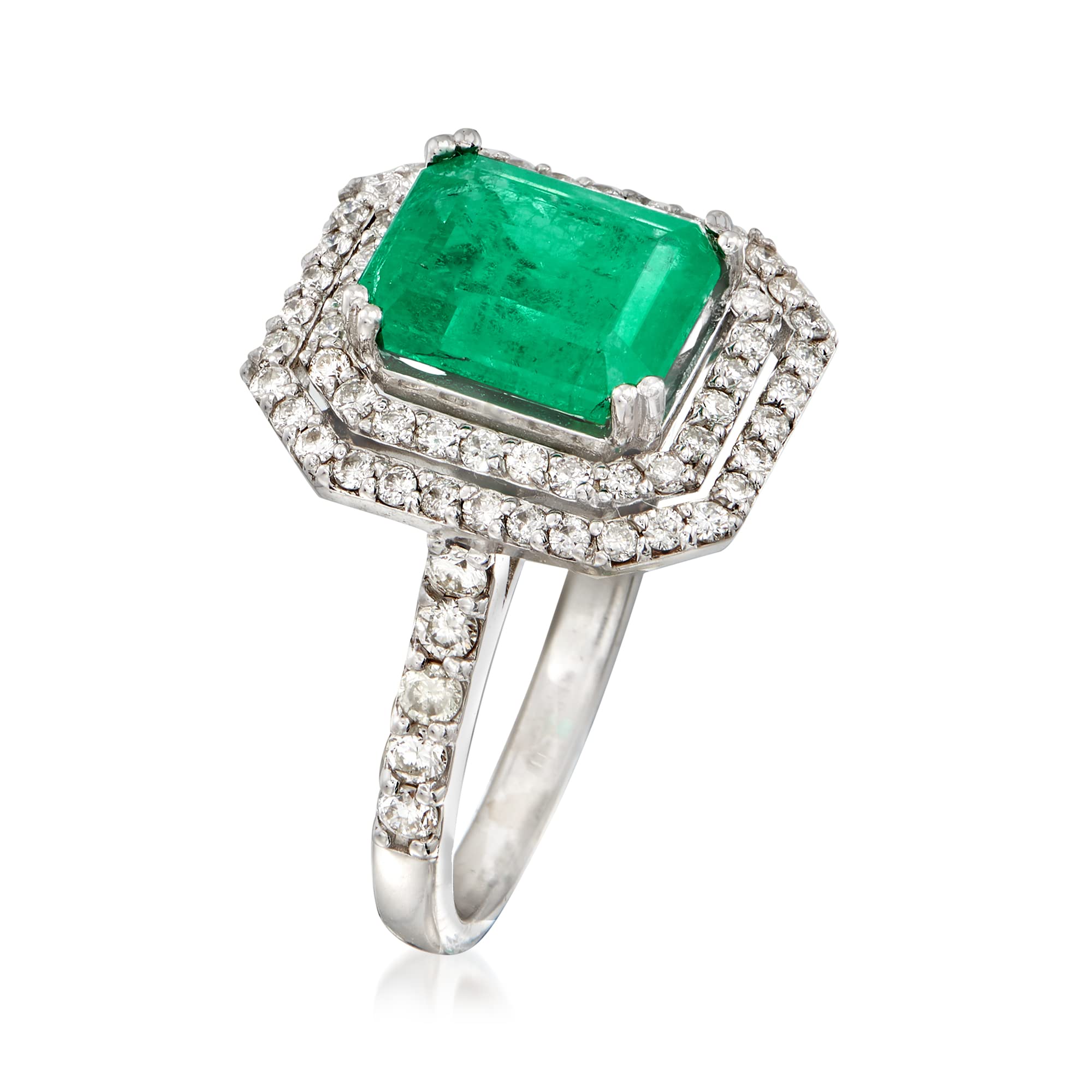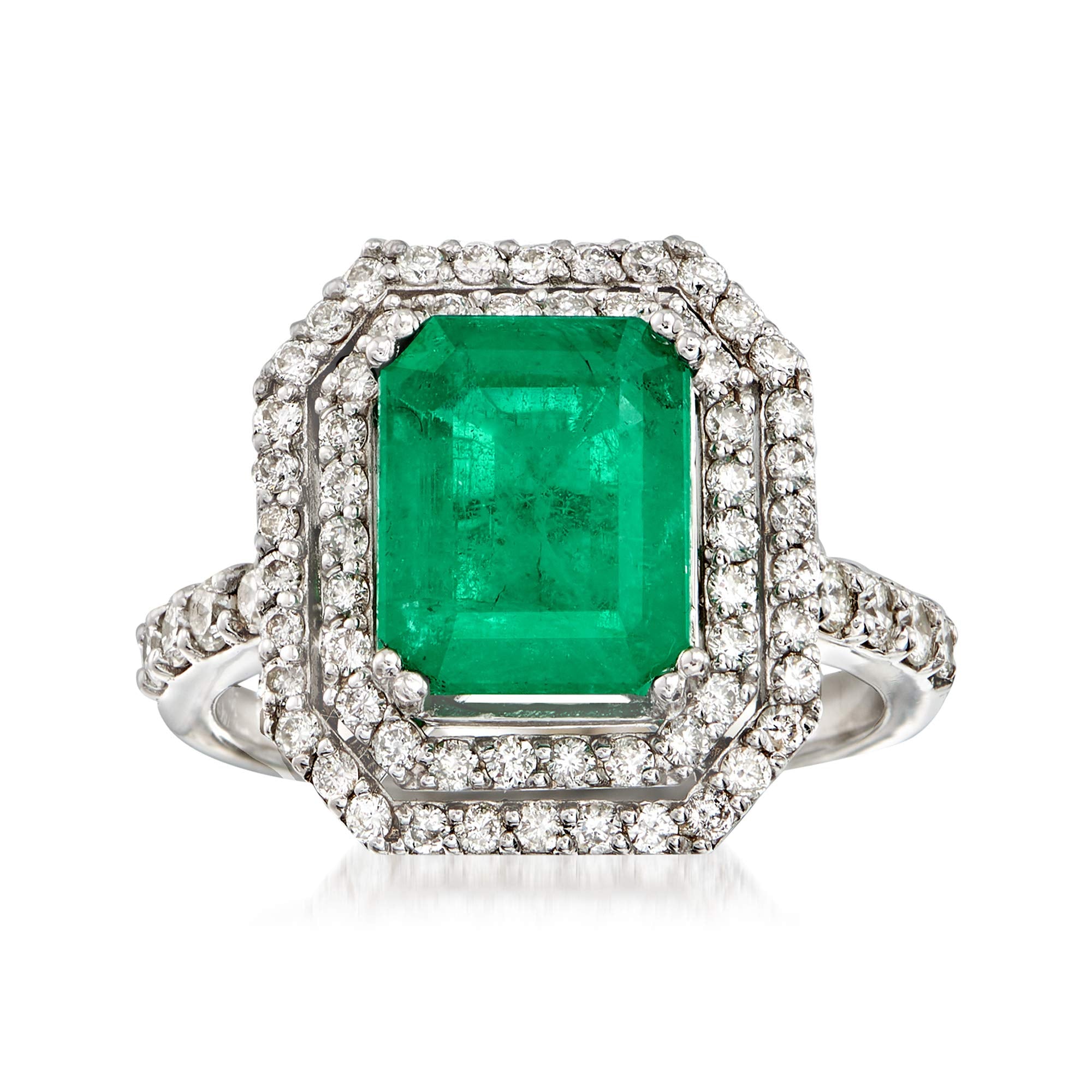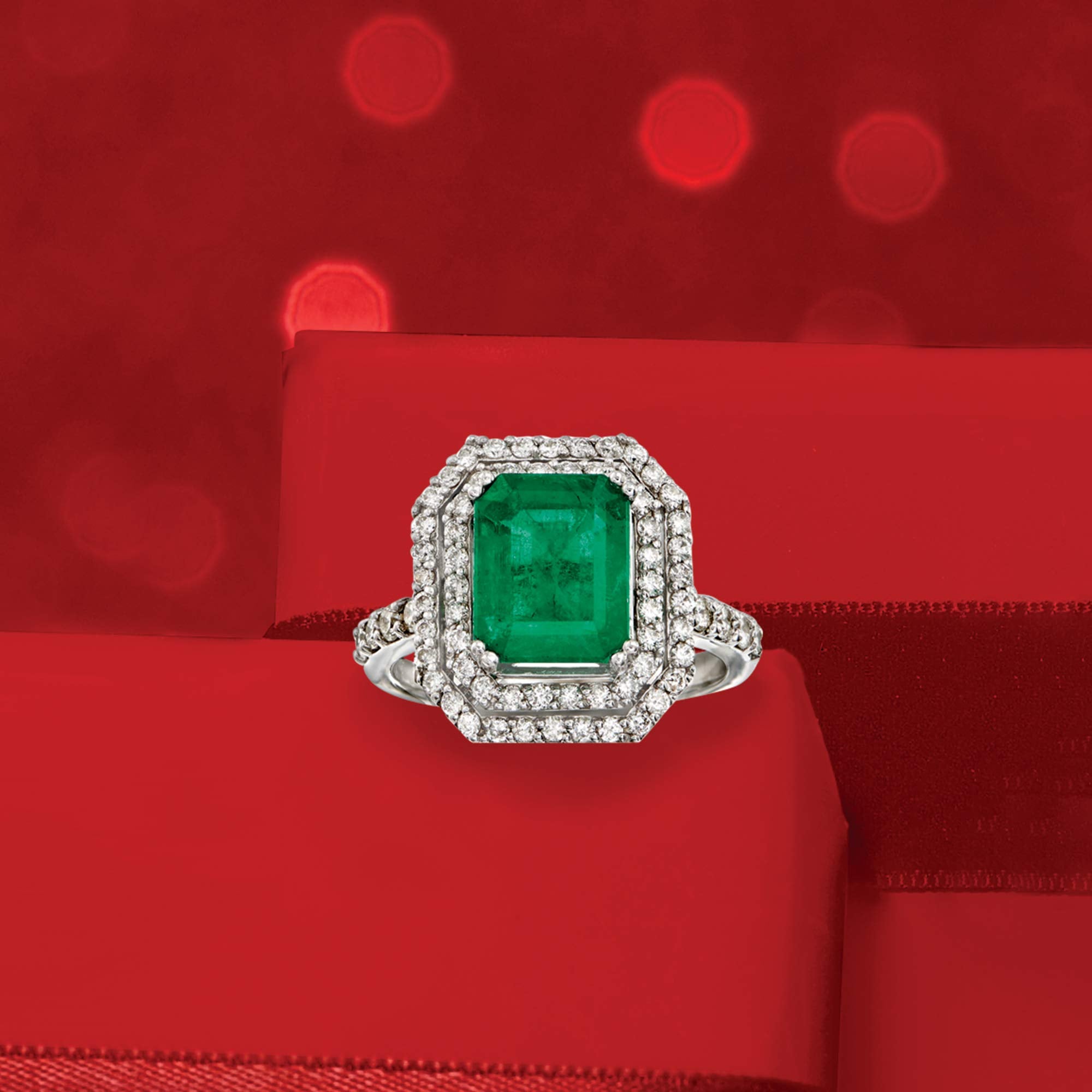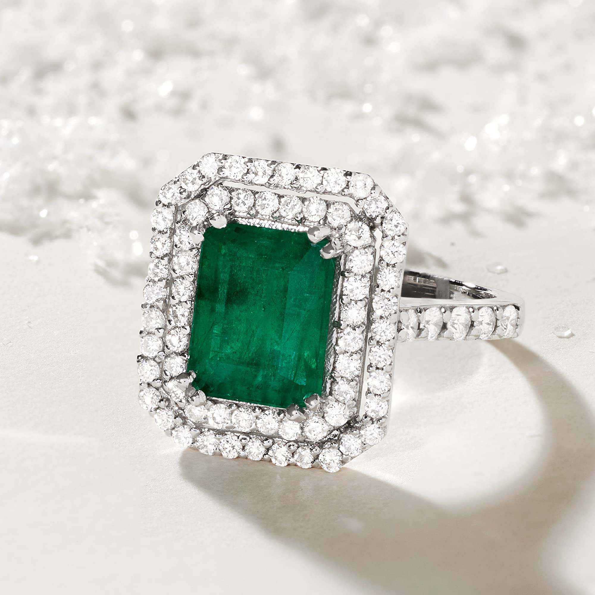 Details: A top-rated jeweler since 1952, Ross-Simons travels the world to find high-quality styles at the best prices. An enticing 3.00 carat emerald glows within a double halo of 1.60 ct. t.w. round brilliant-cut diamonds, which also trail the 14kt white gold shank. Whether you call it a head-turner or a showstopper, this ring for sure makes a statement! 5/8" wide. Diamond and emerald ring. Each Ross-Simons item arrives in a fine jewelry presentation box. Shop Ross-Simons jewelry risk-free as all items include a 30-day, 100% money-back guarantee.
