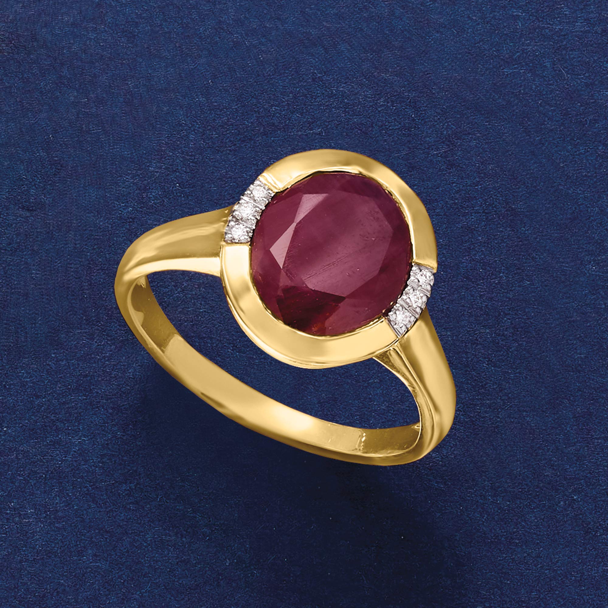Details: Established in 1952, Ross-Simons brings jewelry classics into the modern era. Add a richness to your look with this fiery 5.00 carat oval ruby. Trios of diamond accents spark each side of the glossy 14kt yellow gold setting. 1/2" wide. Diamond-accented and ruby ring.