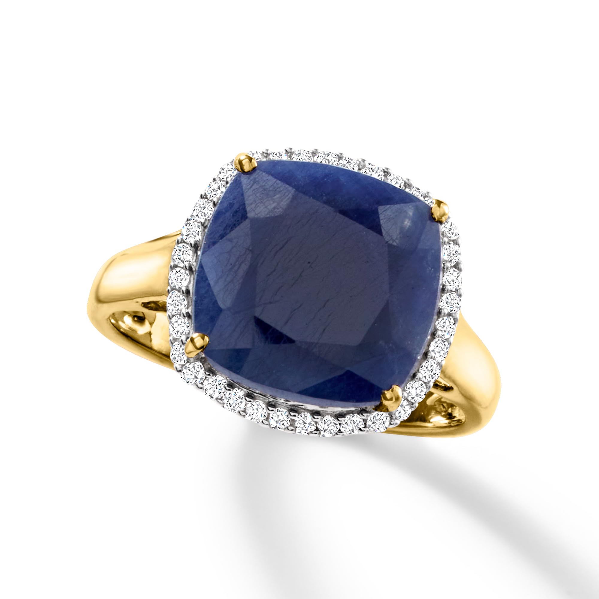 Details: Established in 1952, Ross-Simons brings jewelry classics into the modern era. Bold. Brilliant. Beautiful. This eye-catching ring showcases a 7.10 carat cushion-cut square sapphire in a halo of .16 ct. t.w. round brilliant-cut diamonds. Set in polished 14kt yellow gold. 1/2" wide. Diamond and sapphire ring.