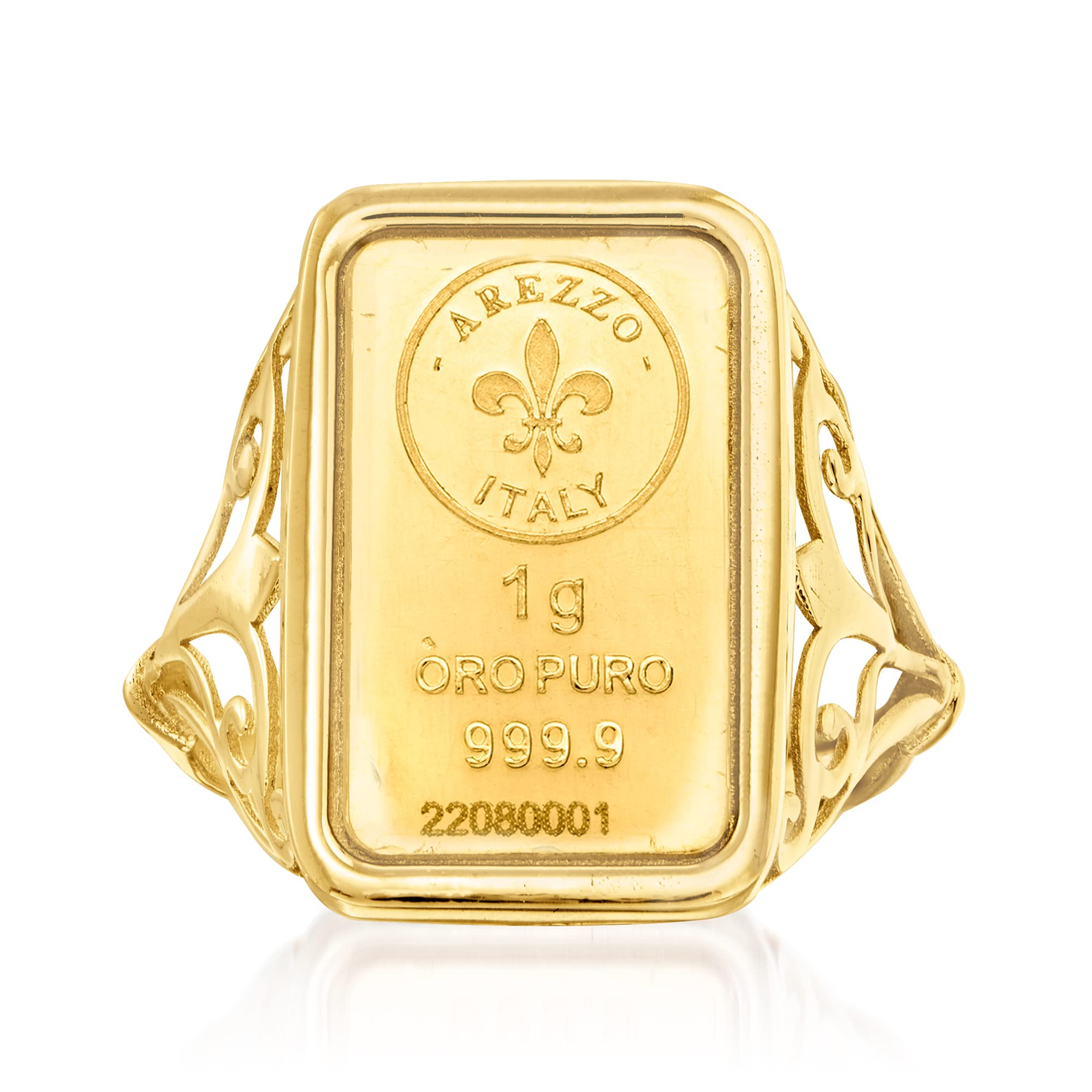 Details: Ross-Simons travels the world to find beautiful, high-quality styles at the best prices. This Italian beauty makes a subtle yet sophisticated statement. Here, a one-gram ingot of 24kt yellow gold is set inside an embellished band of 14kt yellow gold. Polished finish. 5/8" wide. 24kt yellow gold and 14kt yellow gold ingot ring.