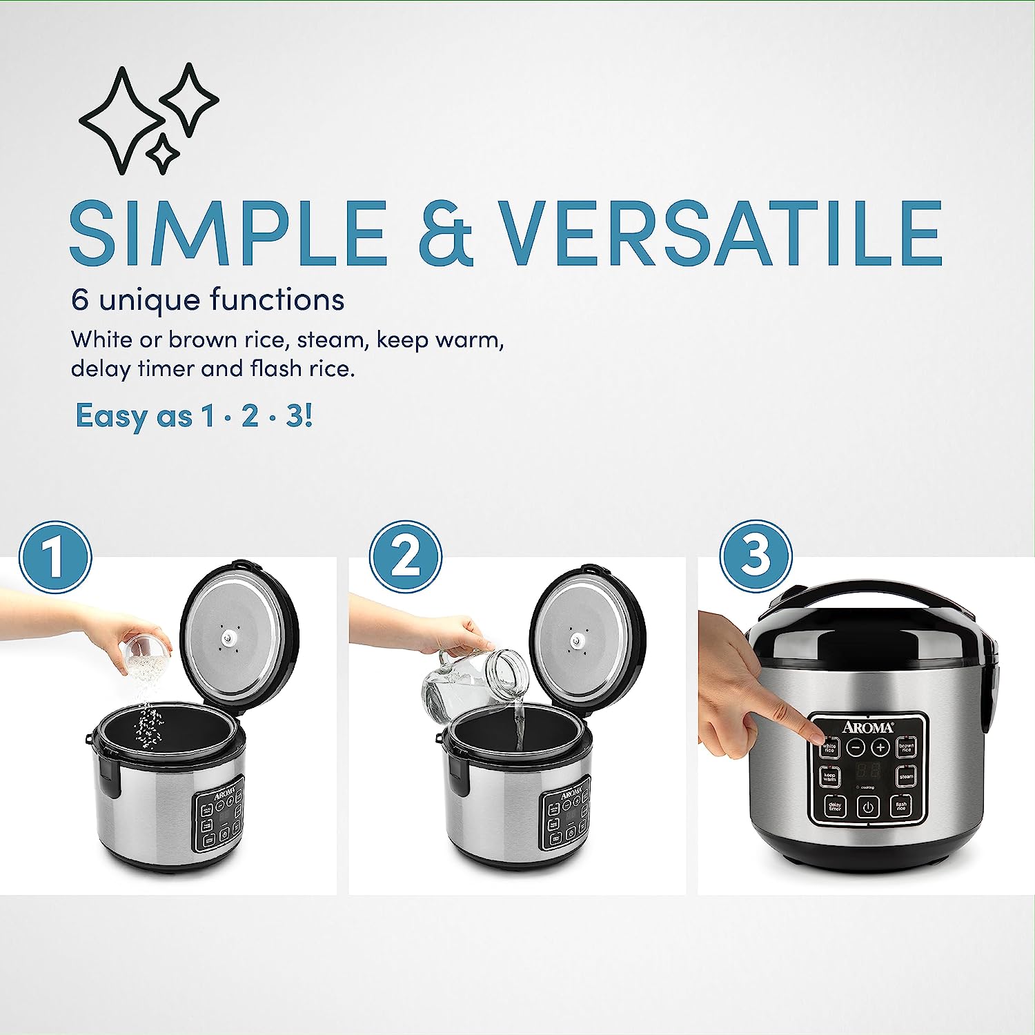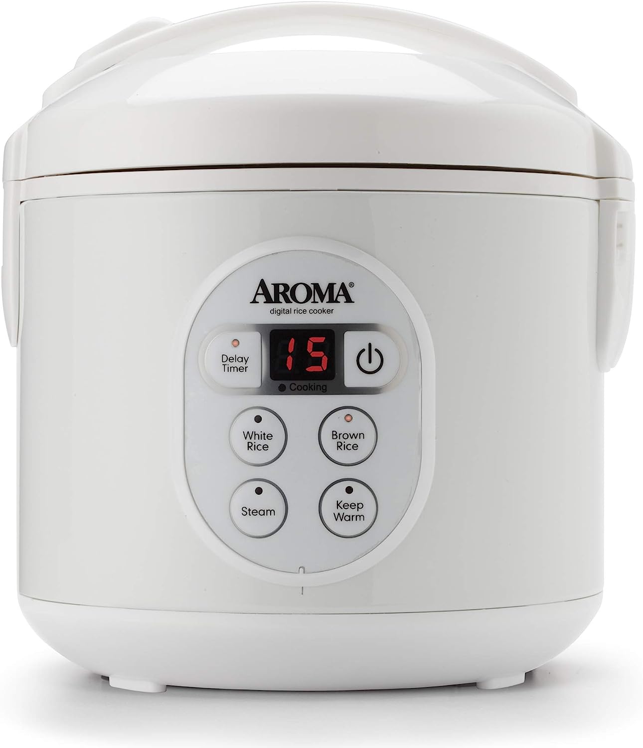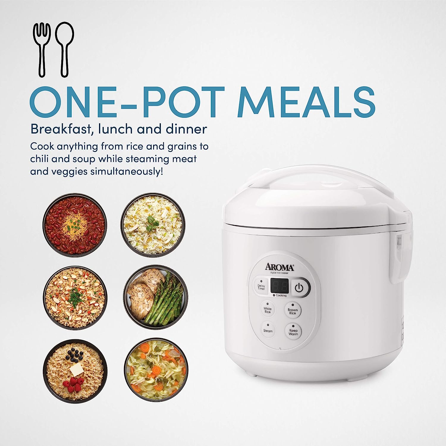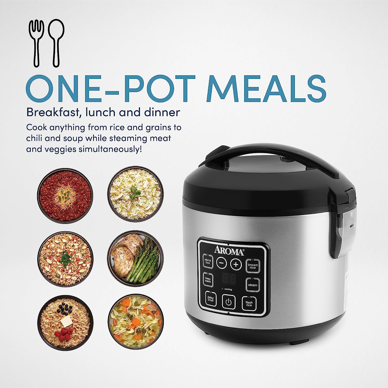 Let aroma do the cooking for you enjoy easy home cooking with the aroma 4-Cup (Uncooked)/8-Cup (Cooked) digital rice cooker & food steamer. Restaurant-quality rice. Healthy steamed meals. Delicious one-pot dishes. Prepare all this and more at the press of a button. Aroma takes the "cook" out of home cooking - turning kitchen time into your time. Help the kids with homework, get creative at play time, or pick up that novel you've been waiting to dive into. All while delivering hot, hearty and healthy meals the entire family will love. Digital convenience this convenient cooker's compact Capacity perfectly cooks 4-Cup (Uncooked)/8-Cup (Cooked) of any variety of rice with specialized functions for both white and Brown rice. Once the rice has finished, it will automatically switch to keep-warm so there's no need for monitoring or stirring. The steam tray allows for healthy steaming of meats and vegetables, even as rice cooks below. It's also suitable for oatmeal, chili, jambalaya, soups, and more. Delay timer the delay timer is designed for people on the go. Place rice in the cooker in the morning, set the delay timer to have rice ready when it's needed and come back to perfect rice ready to serve. Plus, no matter when rice is finished, the cooker will automatically switch to keep-warm for conveniently flexible meal planning. So, no matter what wrenches life throws in your schedule, you'll still come home to a quality meal ready when you are. Easy cleanup cleaning up is never fun. When the cooking is done, the inner cooking pot and all accessories remove for easy cleanup. It is non-stick coated