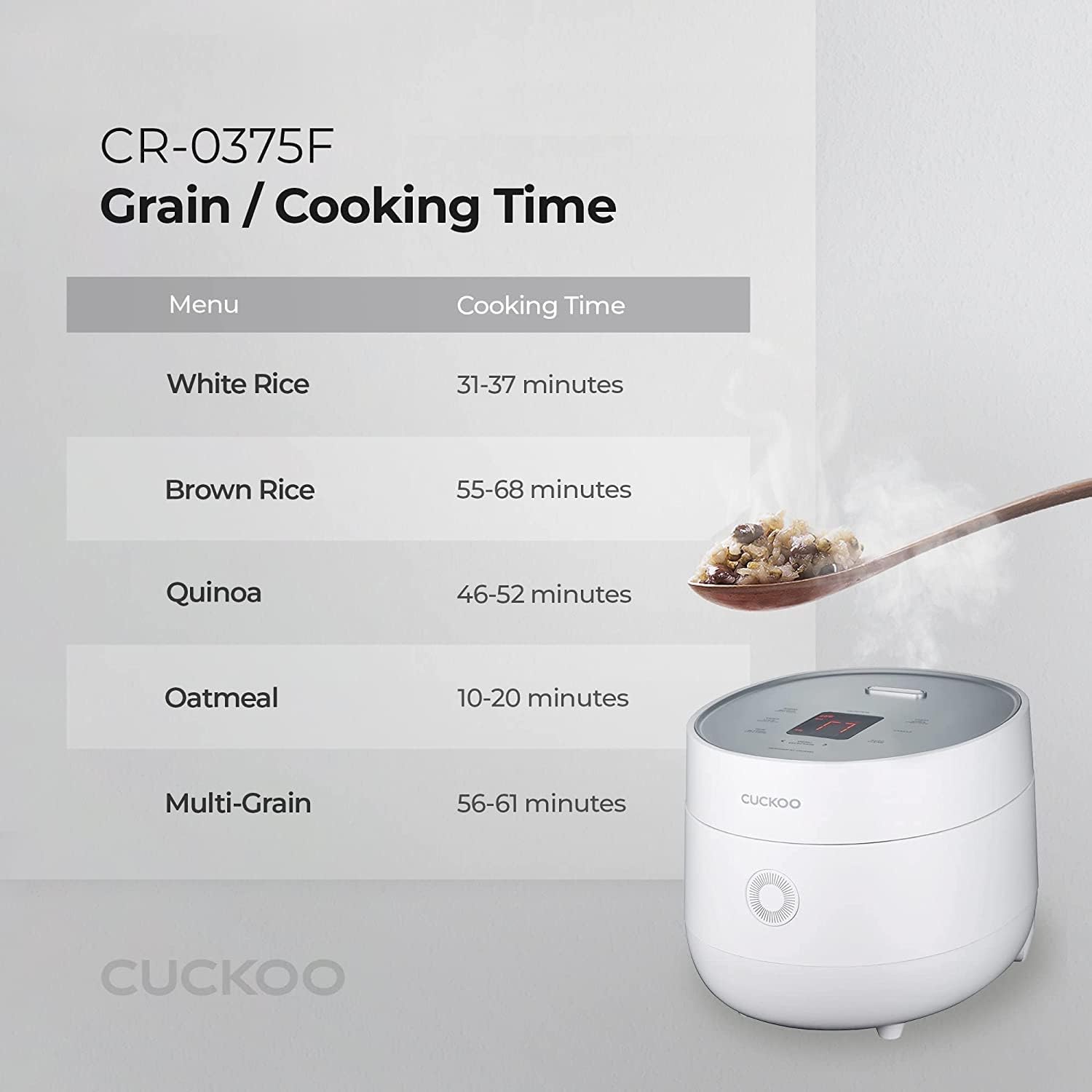 As an industry leader and a trusted Korean brand, CUCKOO strives to consistently deliver premium quality kitchenware and home products to households around the globe. Our 3-Cup (Uncooked) Micom Rice Cooker & Warmer (CR-0375F) boasts preset functions to automatically cook your favorite rice and grains to your own customized liking along with a multi-cook function that can effortlessly prepare soups, stews, porridge, and more! Its reheat function is optimal for leftovers, its keep-warm mode will keep your cooked rice at serving temperatures without overcooking it, and its preset timer will allow you to put ingredients in the inner pot hours in advance and have fresh, perfectly cooked rice ready right when you want it. With seemingly endless features and functions like these, the mealtime possibilities are virtually endless. After the cooking is completed, the convenient auto-clean mode will automatically steam clean your unit for an easy and effortless cleanup while the detachable inner lid can be occasionally removed and cleaned after use to make sure your grains always taste delicious. Featuring high-quality construction and premium accessories, such as the included nonstick inner pot, the rice measuring cup for precise measuring, and user-friendly digital controls, you'll be cooking with confidence in no time.