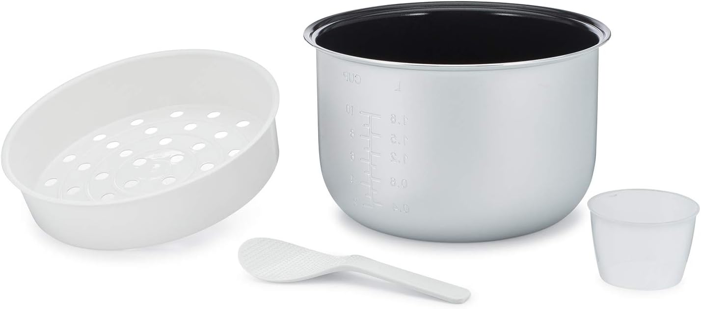• ACCESSORIES INCLUDED: In addition to the non-stick ceramic coated pot, the Zest Plus also comes with a dishwasher-safe steamer tray, rice measuring cup and rice spoon