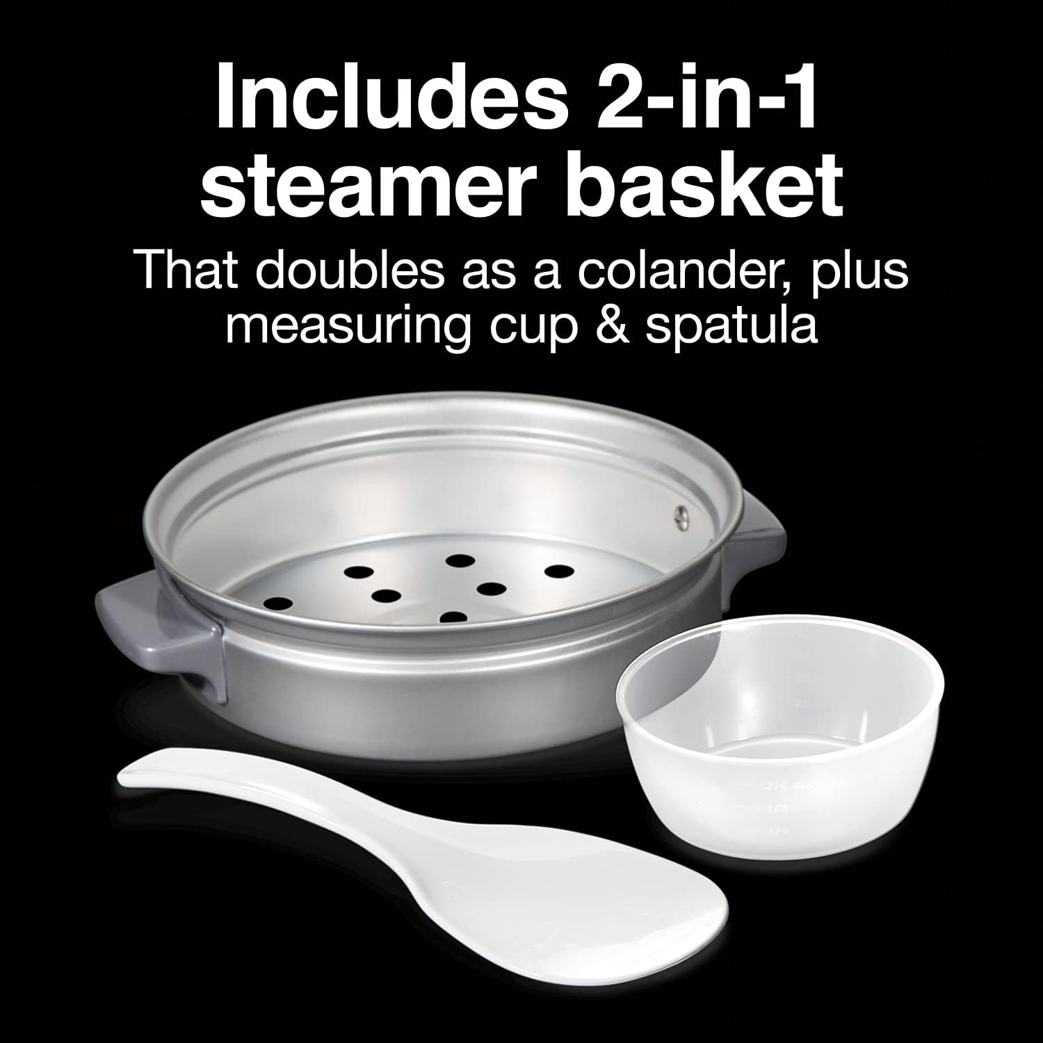 • 2-IN-1 STEAMER BASKET & MORE: The steamer basket is also a colander for rinsing vegetables, or use it to steam food as rice cooks. The cooker also includes a rice measuring cup and a spatula that neatly stores in the handle.