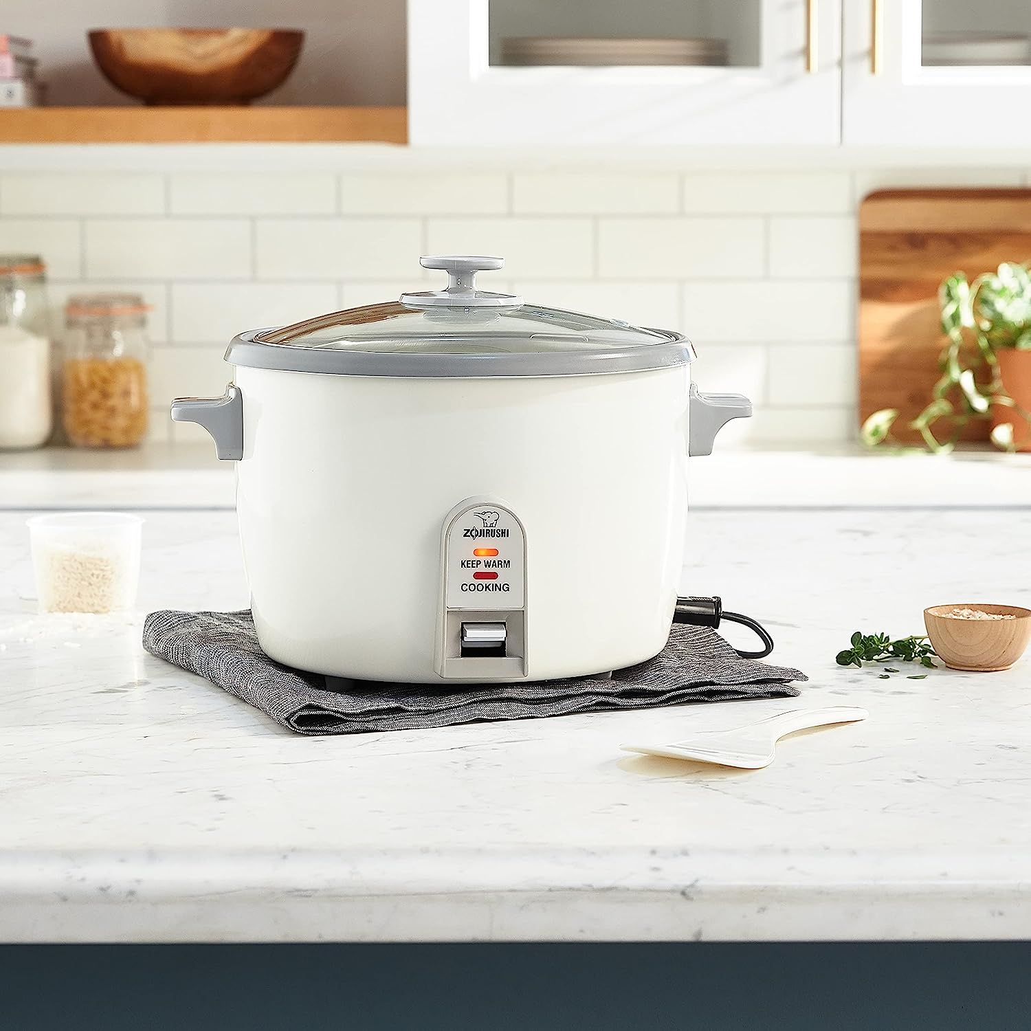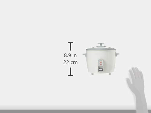 Busy cooks cherish rice cookers. This one cooks up to 3 cups of dry rice (white or brown) and keeps it warm up to five hours. A glass lid permits monitoring of the cooking process. Instructions and a cooking chart explain everything. A measuring cup and serving spatula are included. The cooker operates with admirable simplicity: just push a switch to start. The switch and a light turn off when cooking is completed, and the unit automatically goes into its keep-warm mode. Stay-cool handles on the cooker's sides permit it to be moved. Only plastic scrubbers and mild detergent should be used for cleaning. --Fred Brack