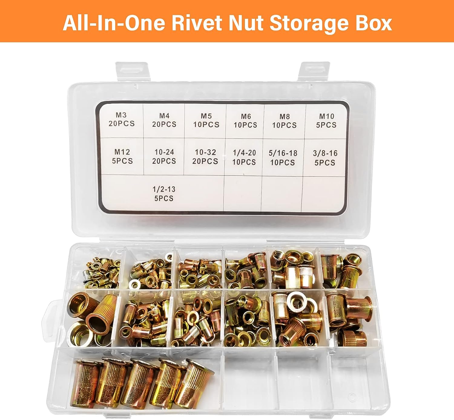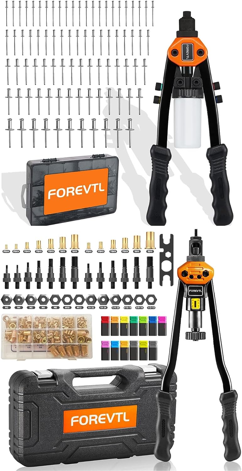 • ✅Get Our All-In-One Rivet Gun Kit & Promise: 210 aluminum rivets with 5 sizes in a compartmented and labeled box, along with a professional hand riveter, 5 nosepieces: 1/4", 3/16", 5/32", 1/8" & 3/32", Perfect for almost any riveting job. We offer a 24-month warranty on our rivet tool kit. Contact us with any questions!