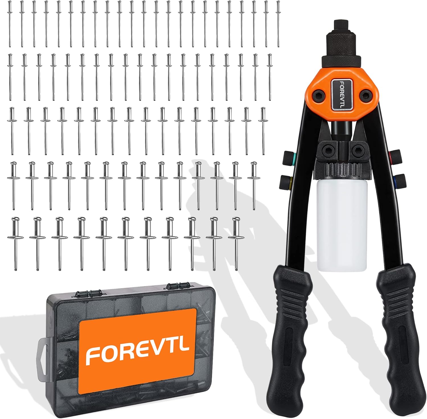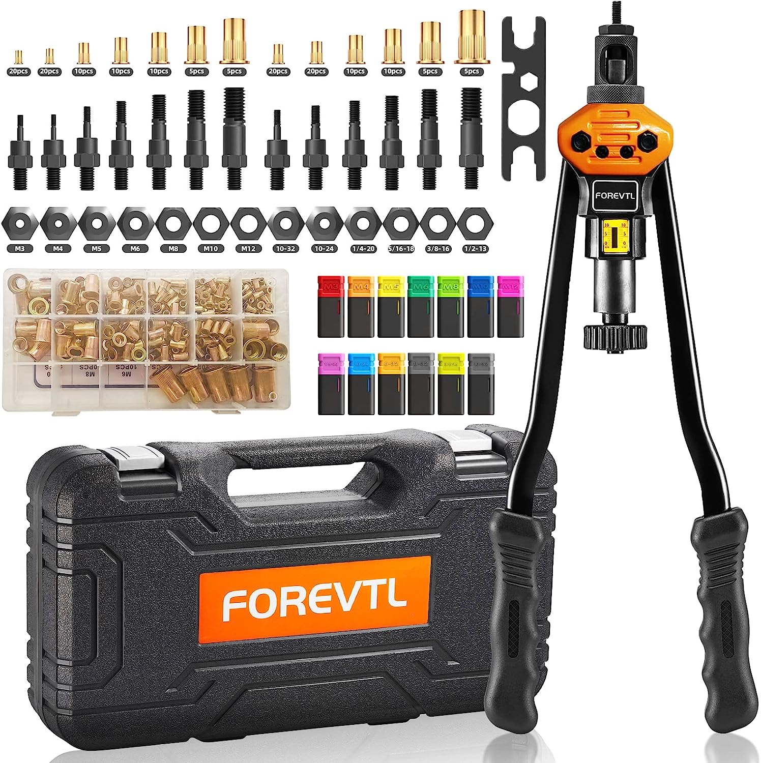 FOREVTL Rivet Gun - Pop Rivet Gun Kit with 210 Rivets (3/32", 1/8", 5/32", 3/16", 1/4'') and 5 Nosepieces, Full Metal 13" Large Heavy Duty Manual Hand Riveter Tool Kit for Metal, Plastic and Leather