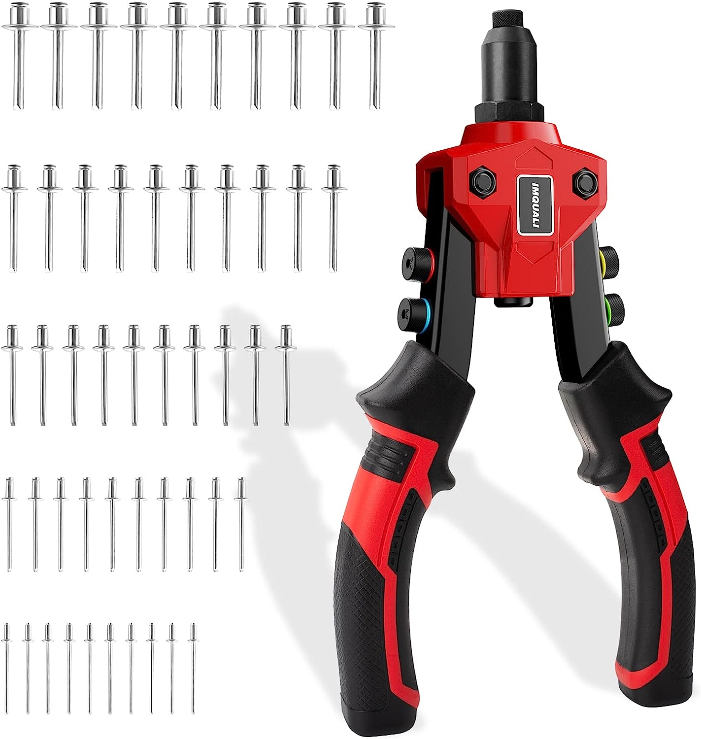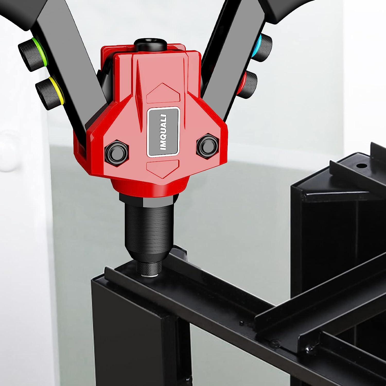 IMQUALI Pop Rivet Gun, Manual Hand Riveter Tool Kit with 400pcs Assorted Rivets Kit, Heavy Duty Hand Riveter with 5 Nosepieces for Metal, Aluminum, Plastic, Tube Stock, Wood, IM20