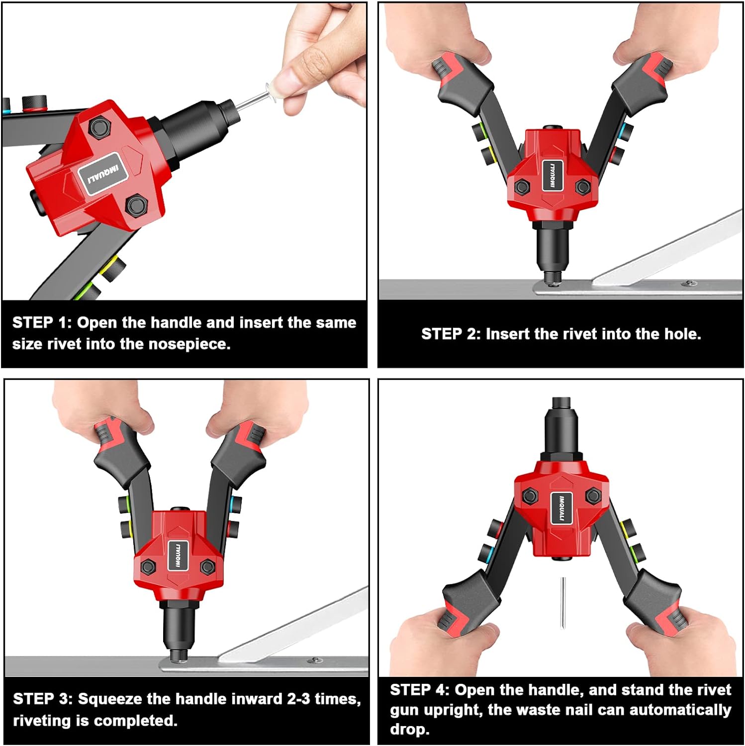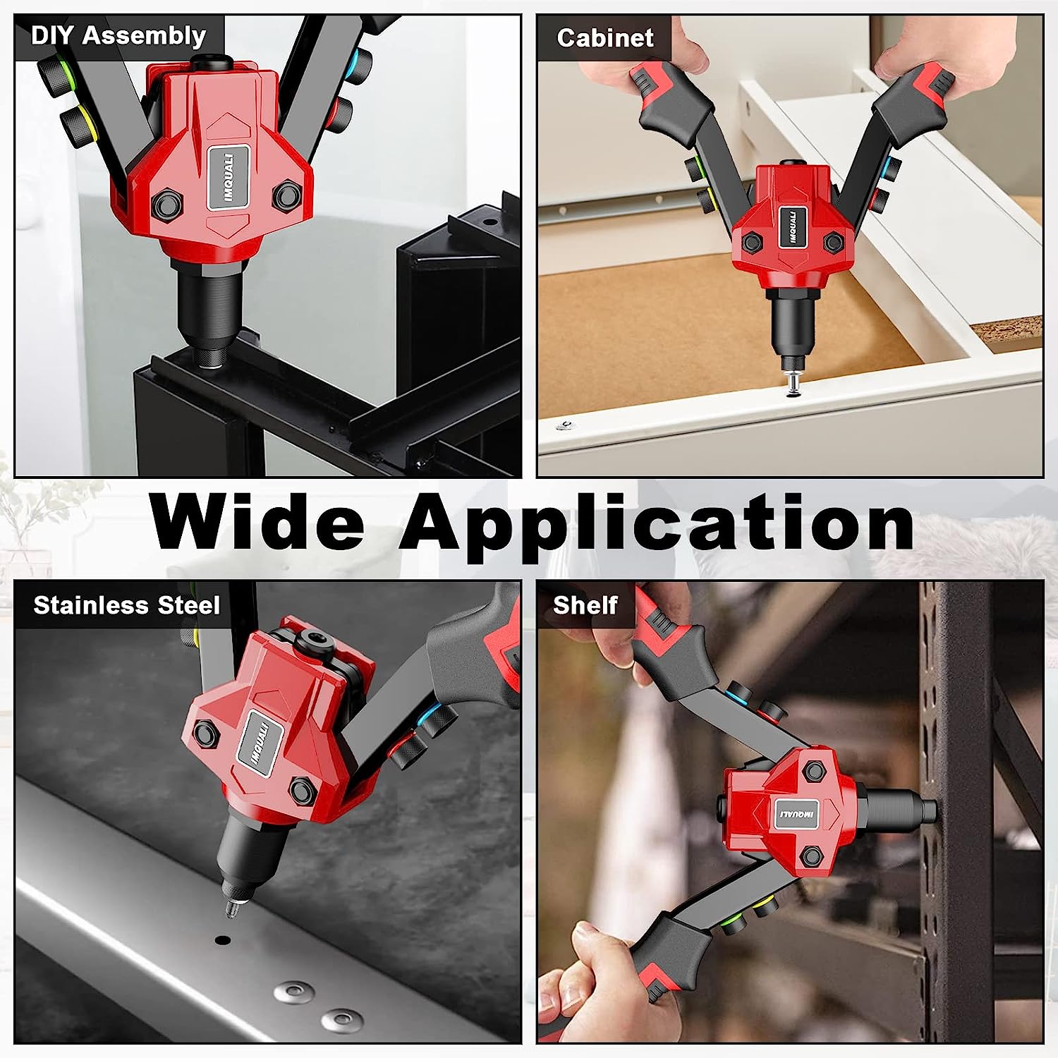 • Wide Application: The rivet gun is perfect for riveting work indoors and outdoors, it can safely and permanently join all kinds of metals, materials, and plates, like automotive, instruments, furniture, doors, DIY tasks, etc.