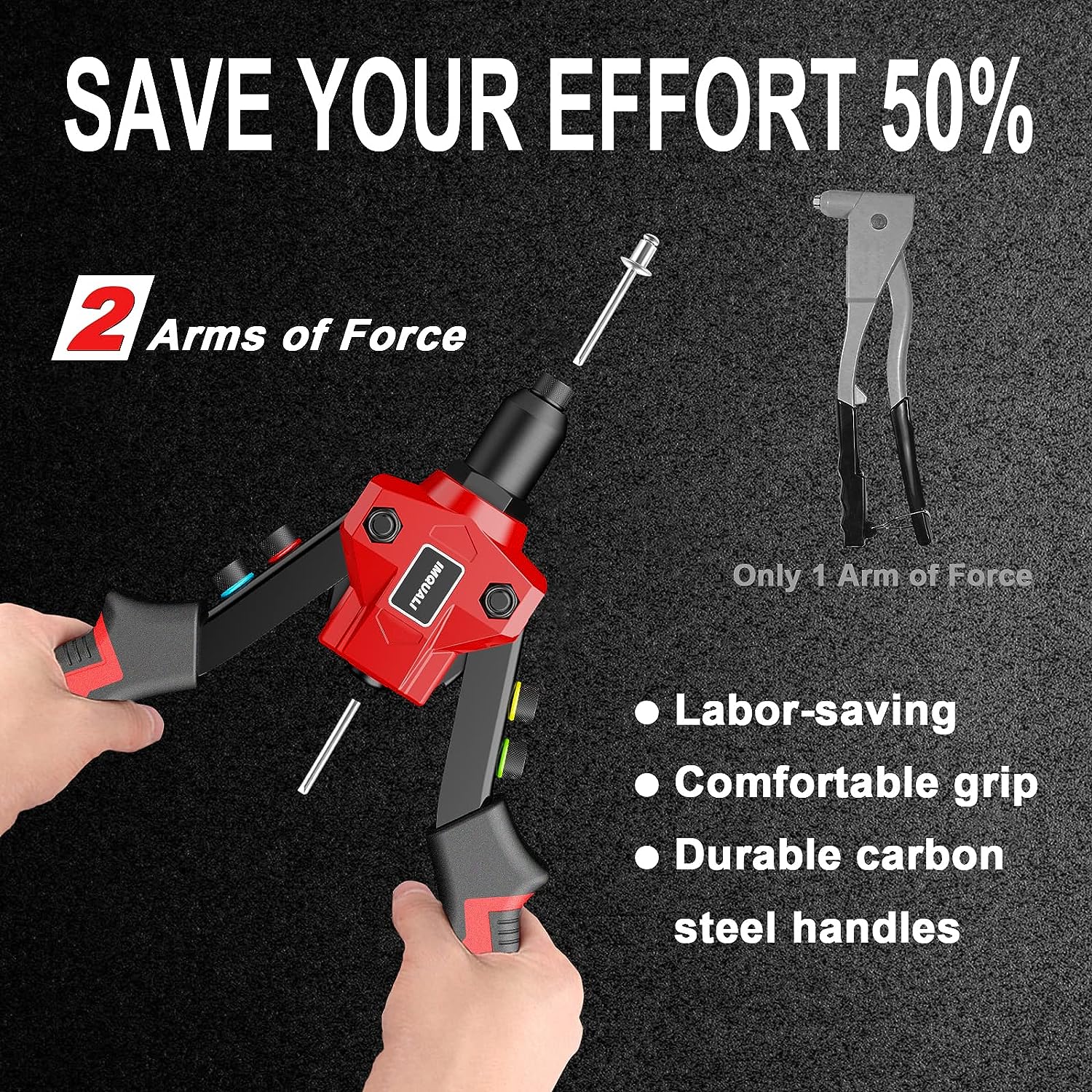 • Nonslip Grips & Compact Size: Ergonomic and reinforced handle for maximum leverage. It makes riveting work easy and quick, without repeated laborious operation on the rivet gun handle. The 10-inch body makes it easier to work in narrow spaces or hard-to-reach places, such as furniture, drawer, and small case. Moreover, it is easy to carry and store.