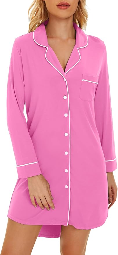 WiWi Viscose from Bamboo Nightgowns for Women Soft Long Sleeve Sleep Shirt Button Down Sleepwear Boyfriend Gown S-XXL