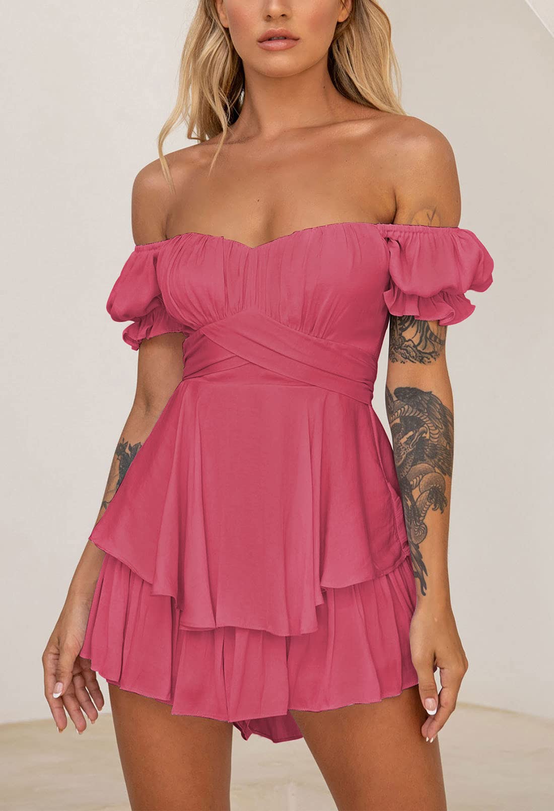 Linsery Lady Strapless Jumpsuit Shorts Off The Shoulder Ruffle Chiffon Beach Romper Casual Summer One Piece Outfits Rose Red M