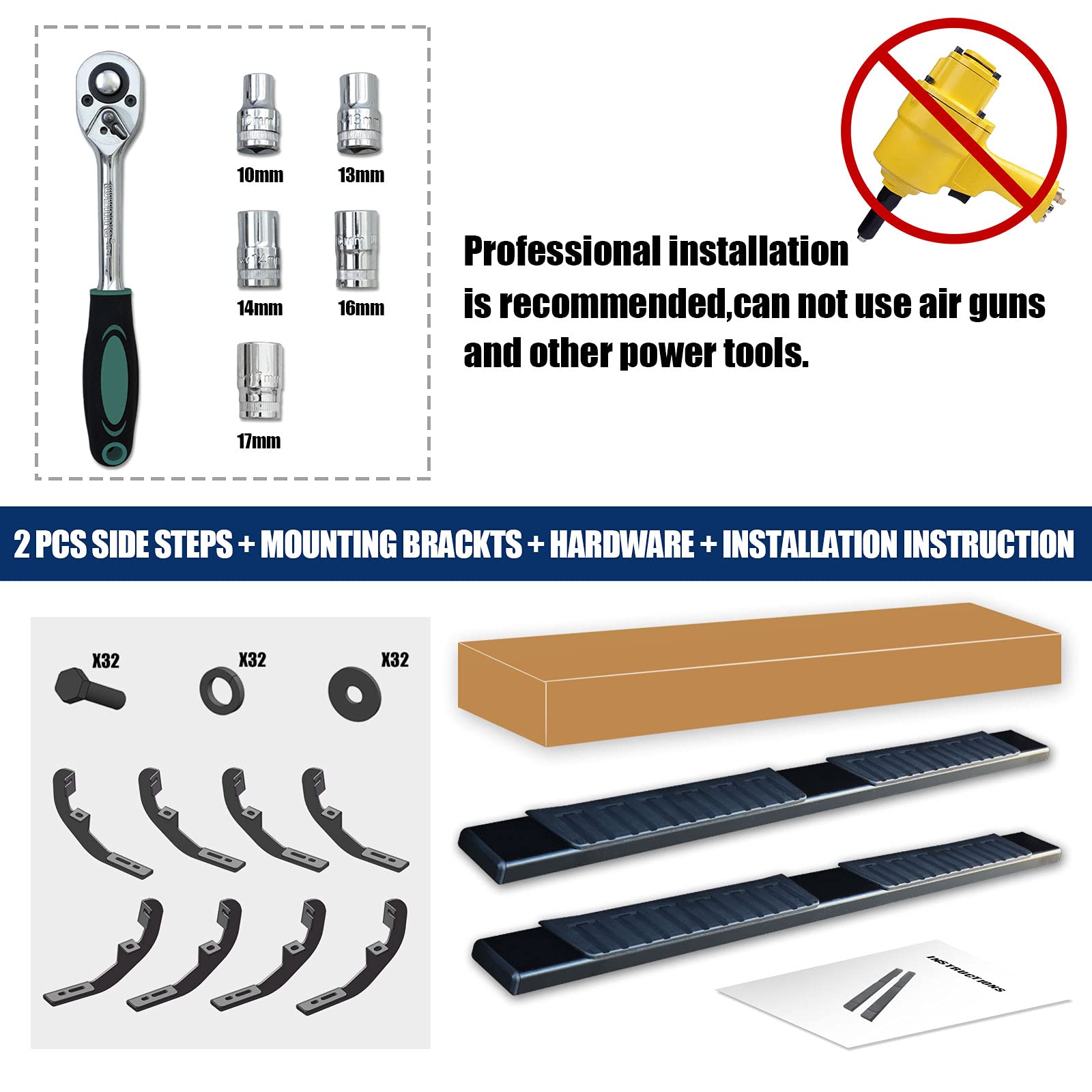 Details: 「SIDE STEP | NERF BAR | RUNNING BOARDS FITS FOR 09-18 DODGE RAM 1500/& 10-18 RAM 2500/3500 CREW CAB」 COMPATIBLE WITH: 2009 2010 2011 2012 2013 2014 2015 2016 2017 2018 Dodge Ram 1500 Crew Cab 2010 2011 2012 2013 2014 2015 2016 2017 2018 Dodge Ram 2500/3500 Crew Cab 2019 2020 Dodge Ram 1500 Crew Cab Classic Model KEY FEATURE: -material: Heavy Duty Carbon Steel -color: Matte Black -size : 3 Inches Bar + 4 Inch Steps -position: Left And Right -surface Finish: Matte Black Finished Tube +plastic Steps PACKAGE CONTENT: -2 X Running Boards -mounting Brackets And Hardware NOTICE: -100% Brand New In Stock -Most do not require drilling(ps:2009-10 models are not equipped with factory holes and will require drilling through the pinch weld to attach the support bracket. The newer years have the hole made already.) WARRANTY: -have Any Quantity Question,free Return&exchange Within 90-day -any Question, Please Feel Free To Contact Us.