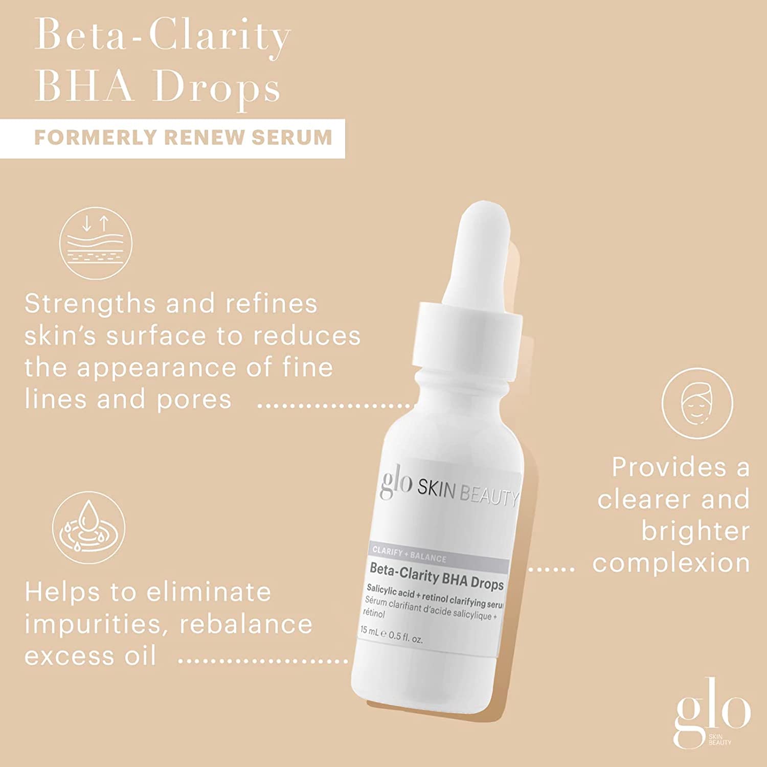 Targeting uneven pigmentation and stimulating cell turnover via gentle exfoliation, Beta-Clarity BHA Drops are loaded with clarifying alpha and beta hydroxy acids to eliminate impurities and rebalance excess oil. Strengthening and refining skin’s surface, the appearance of fine lines and pores is reduced, while radiance-promoting retinol smooths and revitalizes. Perfect for all skin types except extremely sensitive. | Key Benefits: Smoothing: Gentle exfoliation via salicylic and glycolic acids helps refine skin texture, reducing the appearance of fine lines and pores. Clarifying: Alpha and beta hydroxy acids refine skin and help eliminate impurities, rebalancing excess oil, promoting a clearer complexion. Brightening: A powerhouse mix of AHAs and retinol strengthen and brighten skin.