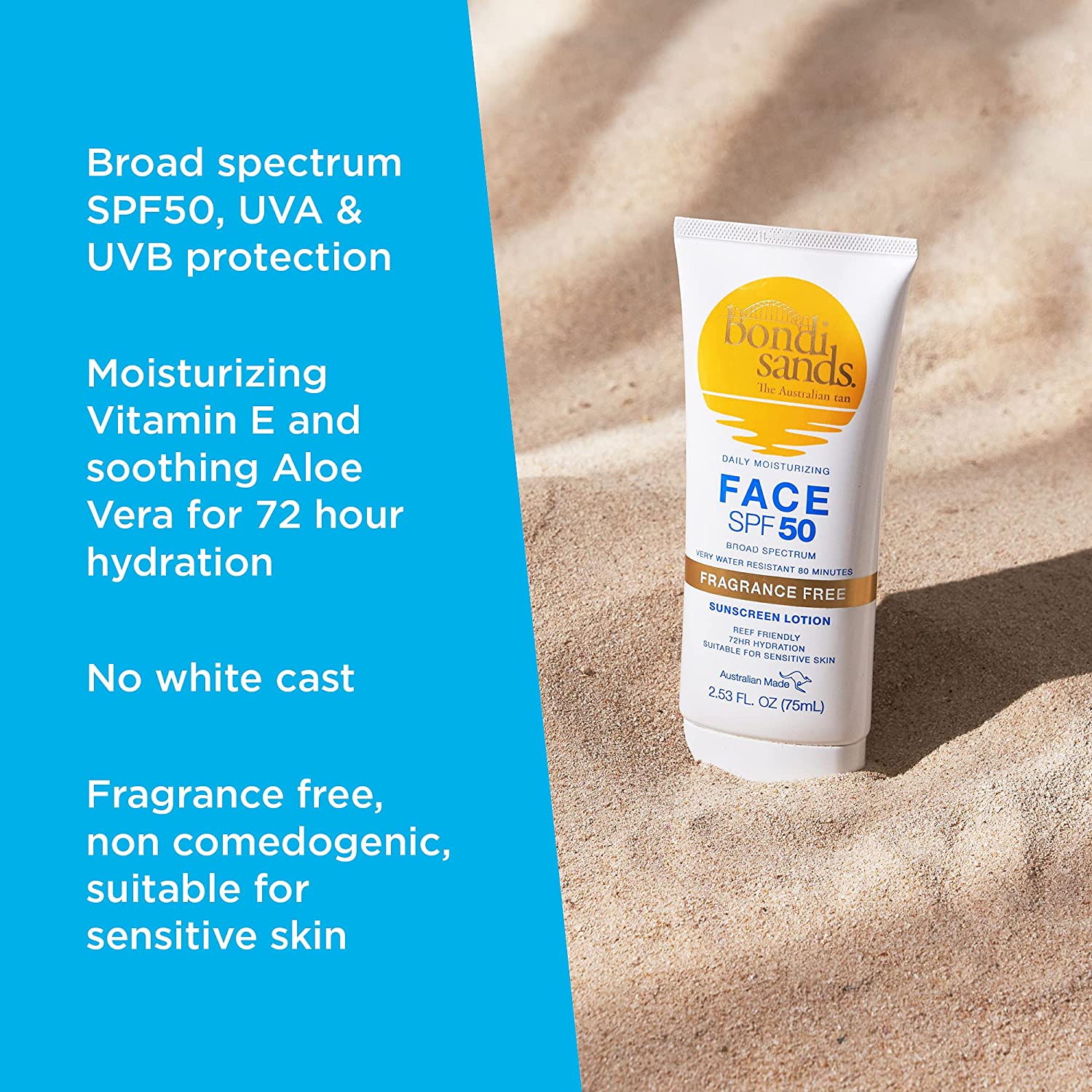 Bondi Sands Fragrance Free Daily Sunscreen Face Lotion SPF 50 | Hydrating UVA + UVB Protection, Non-Greasy, Gentle, Water Resistant | 2.53 Oz/75 mL