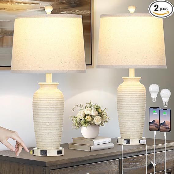 25" Farmhouse Jar Table Lamps Set of 2, Bedside Lamps with USB A+C Ports & AC Outlet, Beige Lamps, Nightstand Lamps for Bedroom Living Room (2 LED Bulbs)