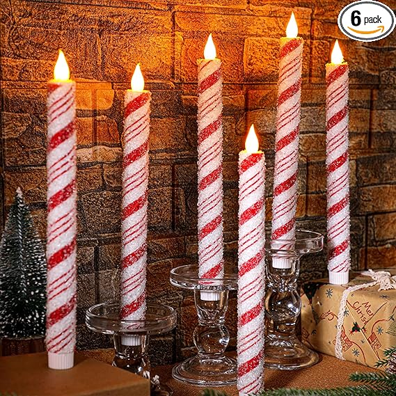 6 Pcs Christmas Flameless Taper Candles 10.6 Inch Glitter Candles Battery Operated LED Christmas Candlesticks for Christmas Centerpiece Holiday Xmas Party Decor(Red White, Sea Salt Style)
