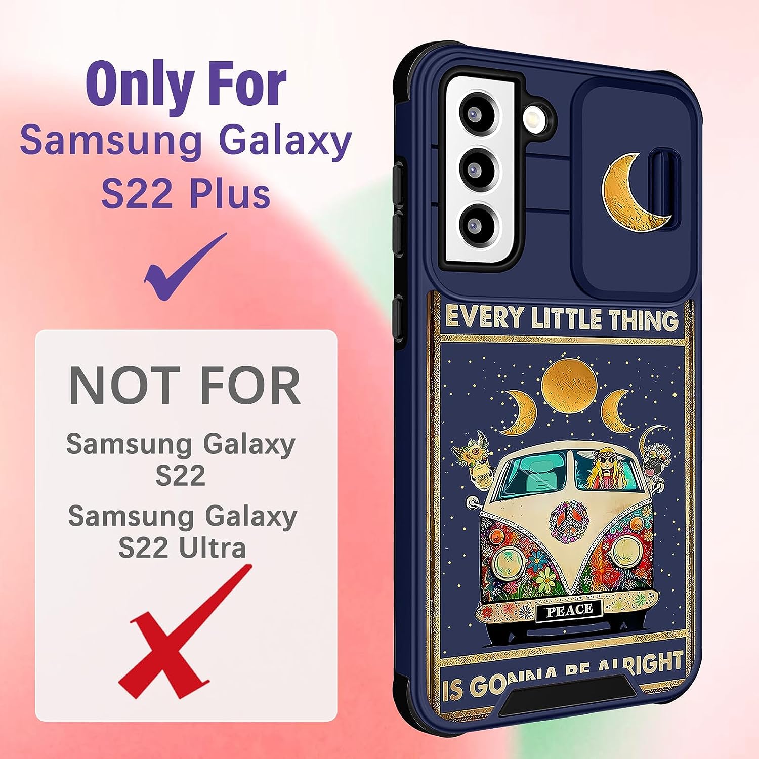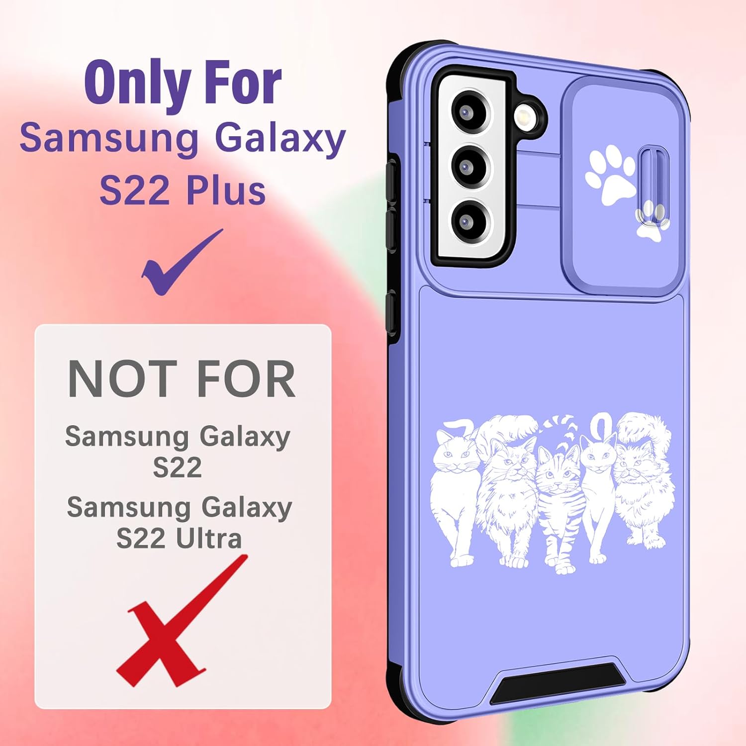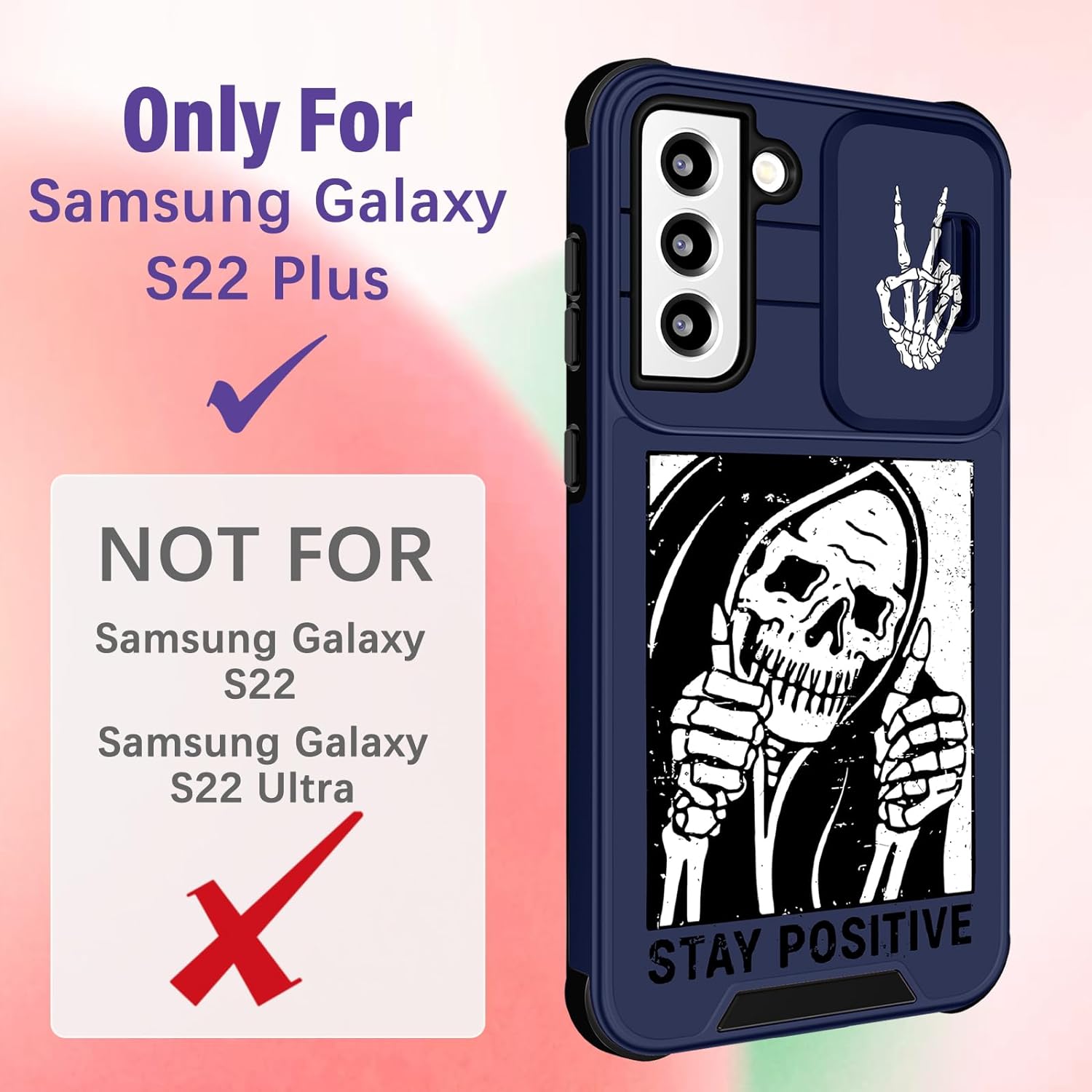• Slide Camera Cover: The unique sliding camera cover design of this for Samsung S22 Plus phone case is really smooth and it can be fixed in a certain position, it protects the camera lens of your phone from bumps and scratches.